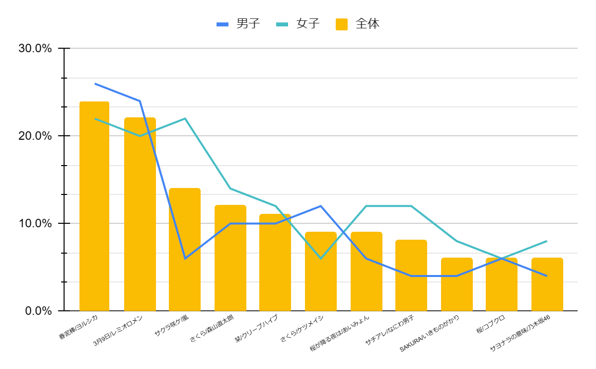 ランキングの上位には、"桜"というキーワードや春らしい爽快感のある楽曲が挙がっており、弊社が2023年2月に公開した調査「卒業式の定番ソングランキング2023」の選出傾向とは異なる結果となりました。