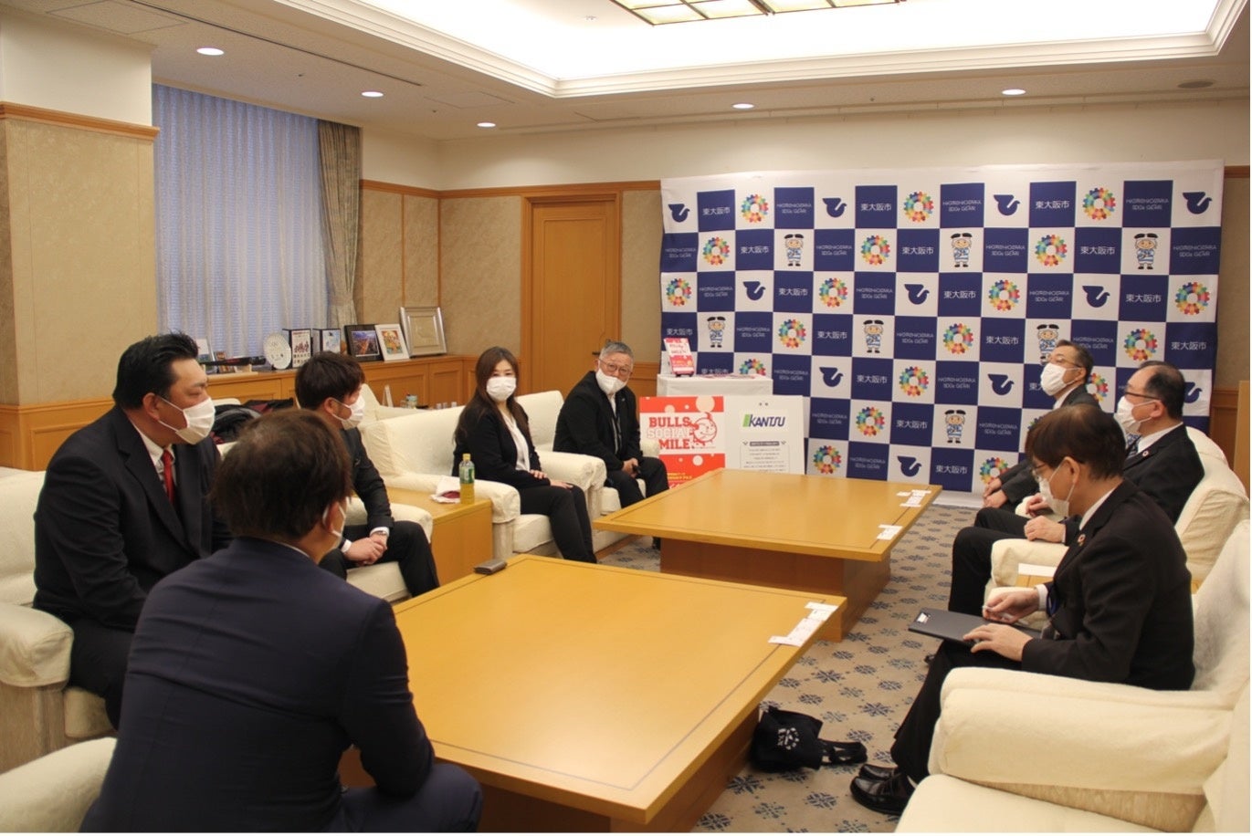 贈呈式には大阪ゼロロクブルズ様より代表取締役 矢白木 崇行様、球団代表兼GM 谷口 功一様、球団監督 藤井 秀悟様、東大阪市より教育委員会教育長 古川聖登様、教育委員会教育次長 北林康男様、副市長 山本吉伸様が出席いたしました。