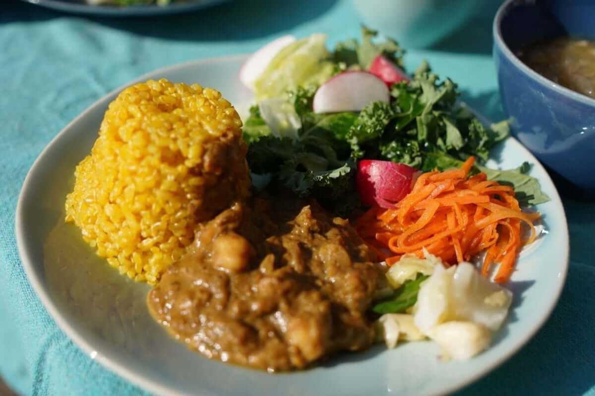 坂尾さんが生産・販売する人気ブランド商品「アフロきゃべつ餃子」作り体験と、「808+DELI 」のシェフに作っていただくベジタブルカレーのランチがセットになったプランです。(※メニュー内容は変わる場合があります)