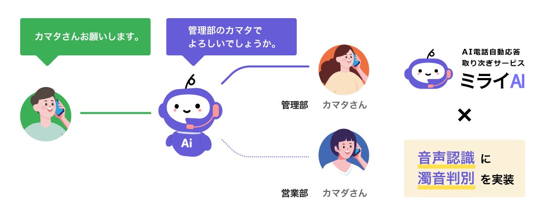 株式会社ソフツー(本社:東京都中央区 代表取締役:鍾 勝雄)は、弊社が開発・提供するAI電話自動応答・取り次ぎサービス「ミライAI」(以下 ミライAI)にて、音声認識時の濁点の有無により似ている氏名を判別できるよう機能改修をいたしました。