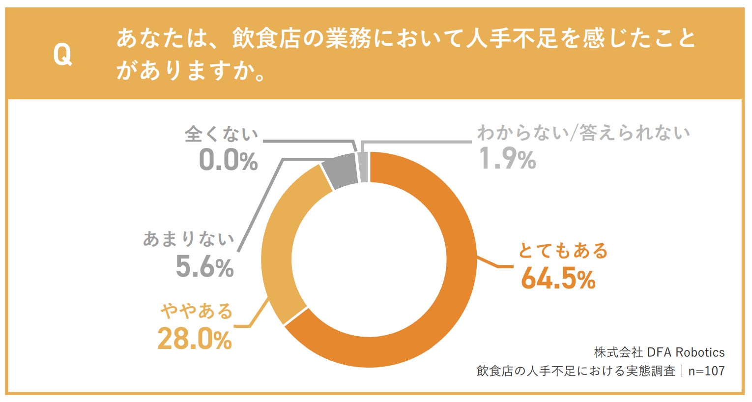 A. 過去に飲食店の社員スタッフとしてホールで働いていた方に調査を行ったところ、飲食店の業務において9割以上が人手不足を感じたことがある結果となりました。