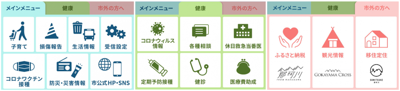 今回のリニューアルでは、リッチメニューを全く新しいデザインに一新しました。「メインメニュー」「健康」「市外の方へ」の3タブを用意しメニューを拡充。様々な市政情報コンテンツを提供することが可能となりました。