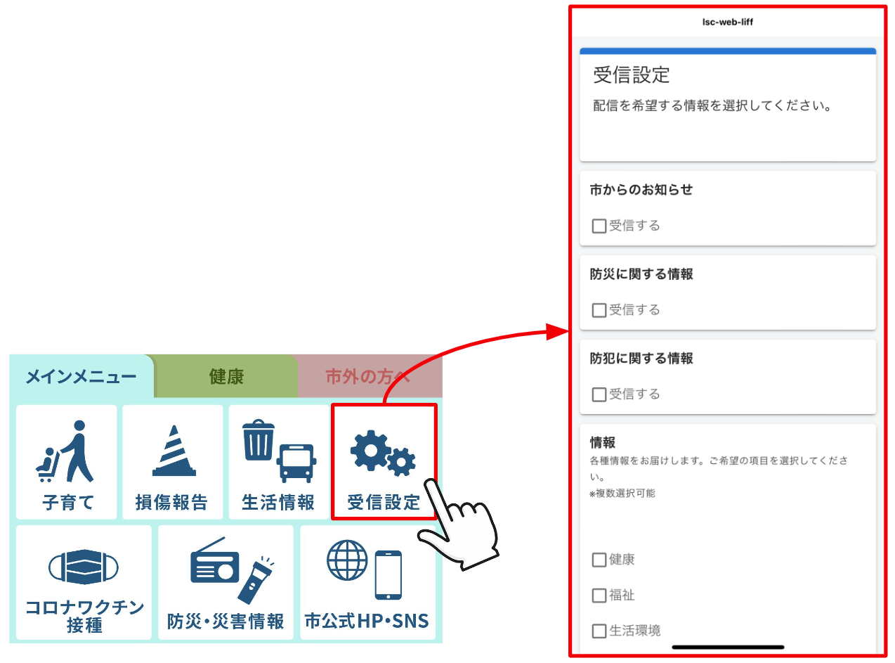 受信を希望する情報カテゴリーを選択できる受信設定もリニューアルされました。これまで以上に幅広い情報の中から、関心のある情報カテゴリーを選択することができるようになりました。これにより、自身のニーズに合わせた情報を受け取ることが可能になります。