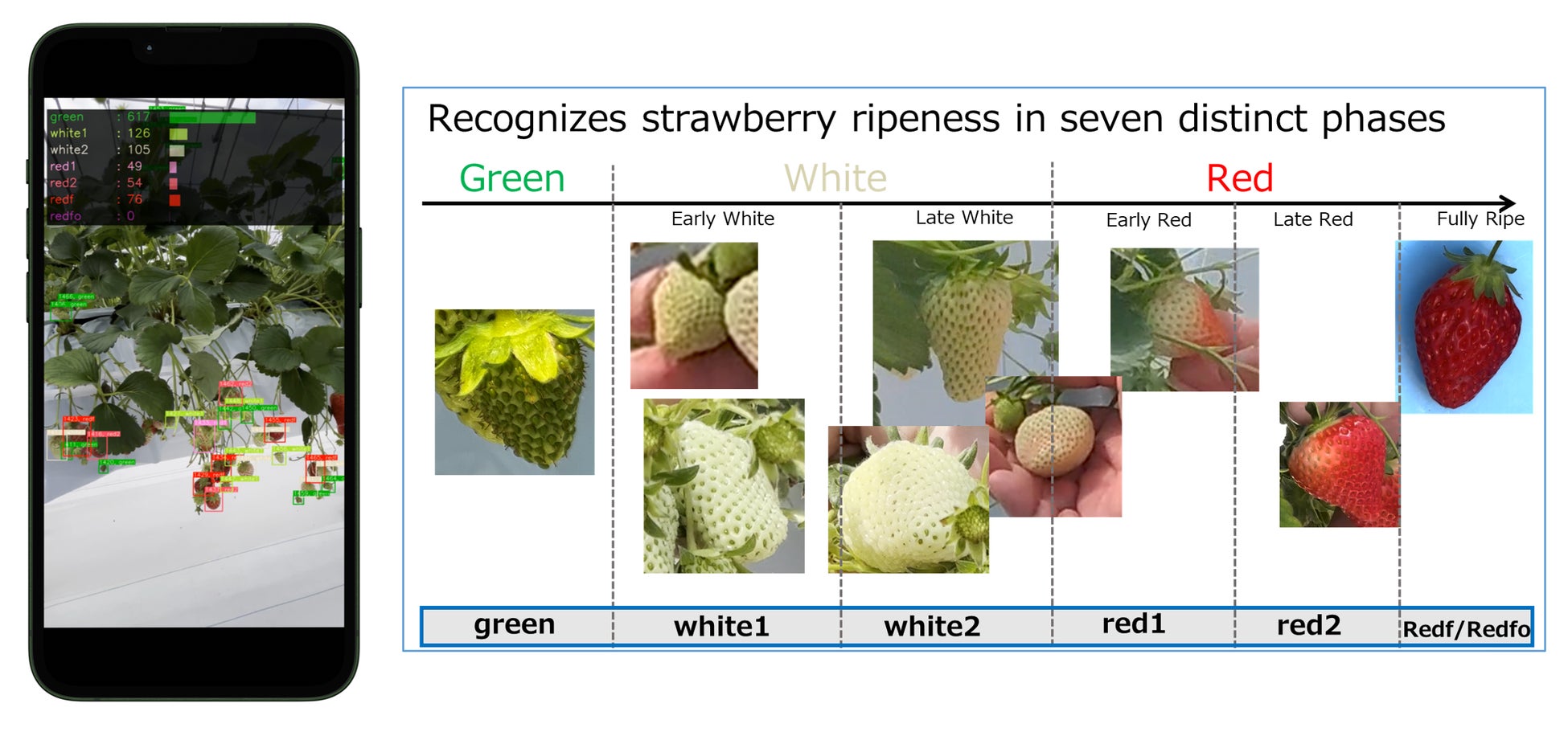 Tokyo, Japan – December 5, 2024 - Simple Growth and Yield Forecasting for Strawberry Cultivation. A new tool is now available that makes growth and yield forecasting straightforward. Simply upload a video taken with your smartphone, and the cloud-based system analyzes the ripeness of strawberries, counts the number of fruits by ripeness stage, and provides growth forecast information based on accumulated temperature data. With ease of use and high-precision analysis, this tool contributes to the advancement of cultivation management.