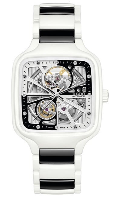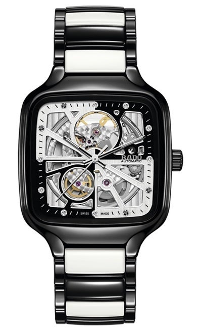 ブラックとホワイトのこの魅力的なモデルは、すでに高い評価を得ているトゥルースクエア オープンハート コレクション初のバイカラーモデルです。ラドーを代表する素材であるハイテクセラミックで作られていて、各モデルとも、8個のトップ ウェッセルトン ダイヤモンドと4個のブラックダイヤモンドが時を刻み、印象的なビジュアルを演出しています。