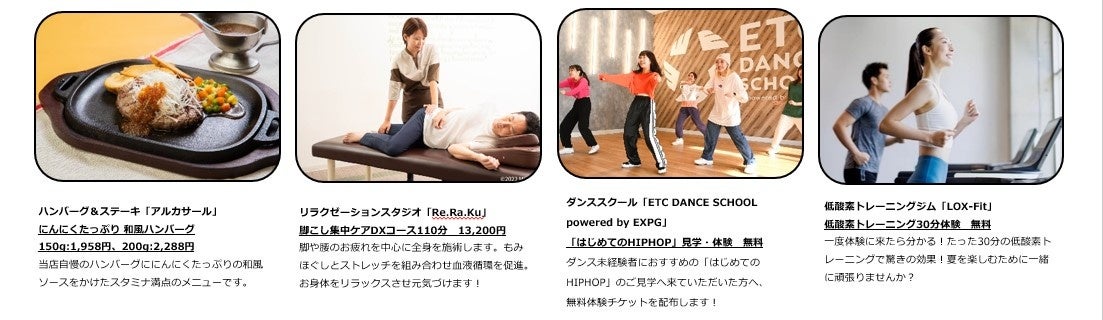 にんにくたっぷりのジューシーなハンバーグやスパイスの効いた栄養満点のカレーなど、食欲をそそるスタミナメニューは夏バテ対策にぴったり!パワーみなぎる身体づくりに効果的な低酸素トレーニングや、血液循環を促すボディケア等のサービスメニューも充実。心も体もリフレッシュして、暑い夏を乗り切りましょう!