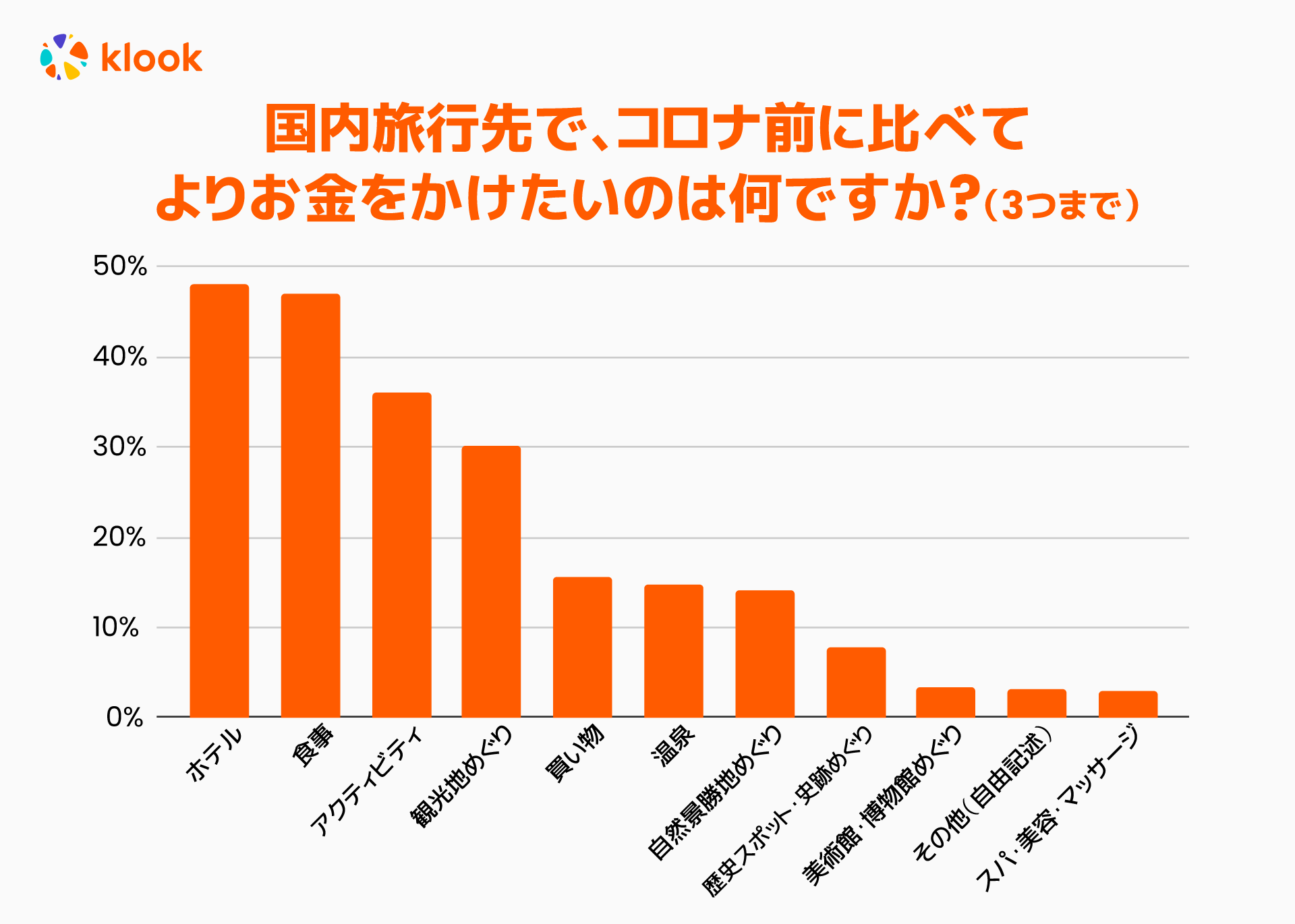 ボーナスでこの夏国内旅行に行く人に、国内旅行でコロナ前よりお金をかけたいことについて聞いたところ、1位はホテル、2位は食事、3位はアクティビティ(文化体験・アドベンチャー・マリンアクティビティ・クルーズ等)という結果になりました。国内旅行の場合、宿泊や食事、観光、アクティビティなどのコト消費にお金をかける傾向のようです。