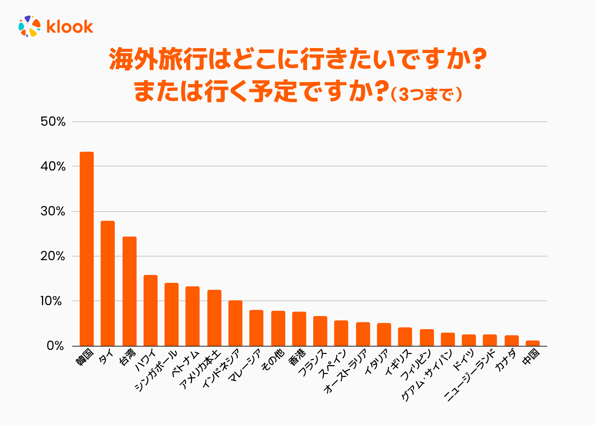 海外旅行先として1番人気は韓国、次いでタイ、台湾とアジア諸国が上位に