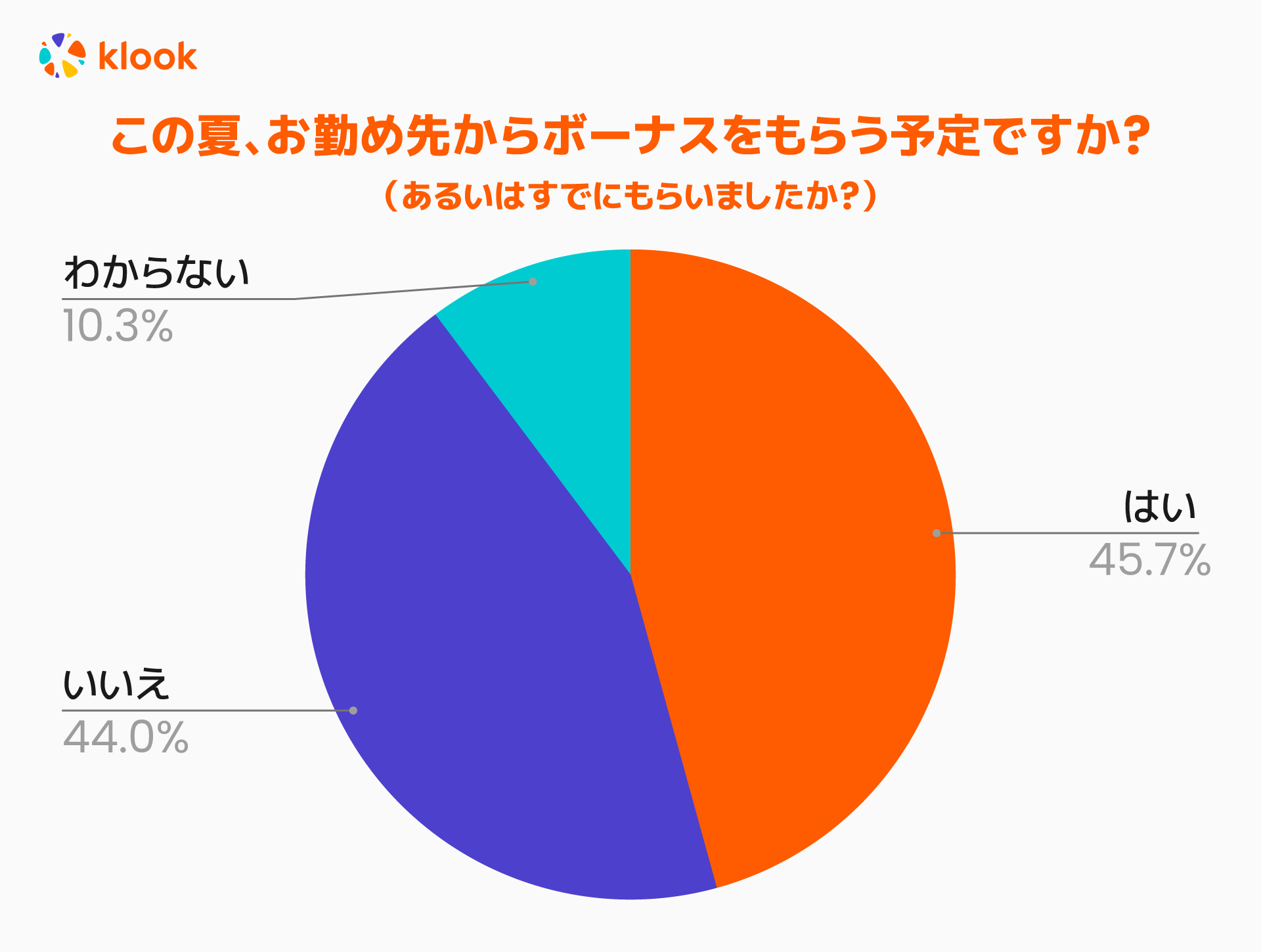 はいと答えた人は45.7%、いいえは44.0%、わからないは10.3%となり、ボーナスをもらう人ともらわない人がほぼ同数という結果でした。