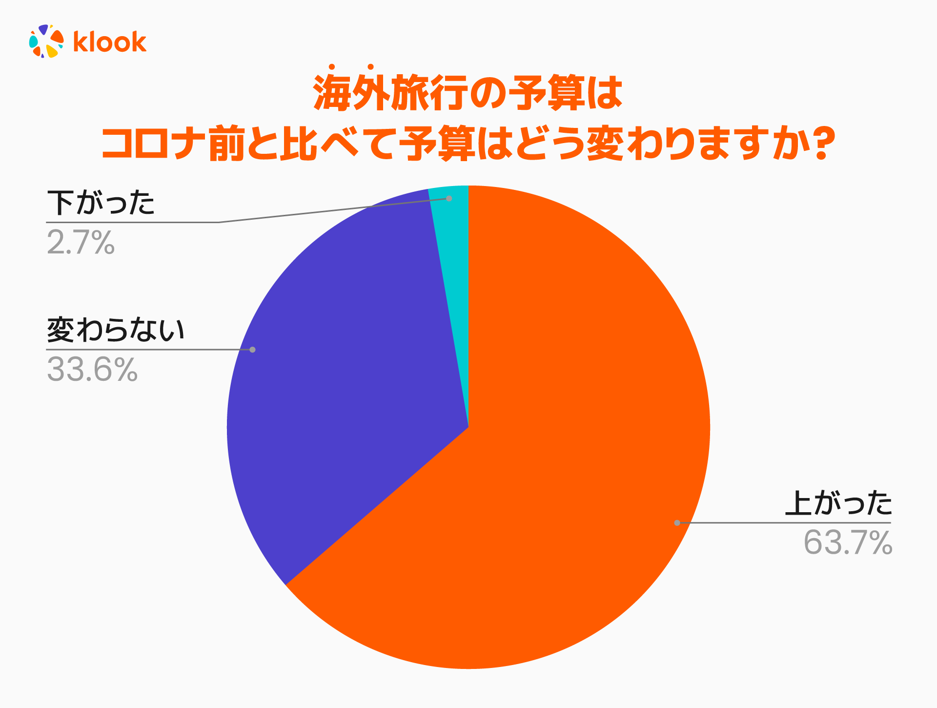 海外旅行の予算はコロナ前と比べて「上がった」と回答した人が63.7%となり、「変わらない」の33.6%、「下がった」の2.7%を大きく上回る結果となりました。国内旅行予算と比較して「上がった」と回答した人の割合が倍以上になっているのは、やはり円安や物価高、燃油高の影響が大きいと推測されます。