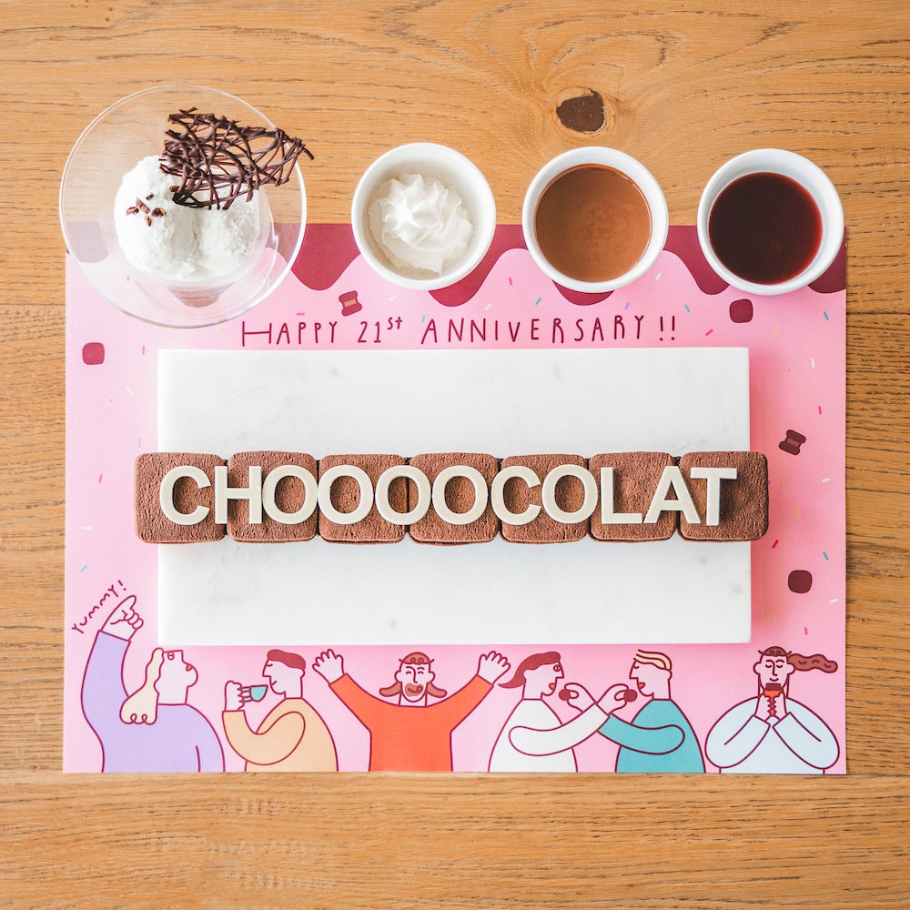 VANILLABEANSの看板商品「ショーコラ」21周年を記念した限定カフェメニュー。人気フレーバー「ショーコラ・リッチミルク」を7個分楽しめるブランド史上最も長い生チョコレートサンドです。別添えのトッピングは「自社製アイスクリーム、カカオの果肉”カカオパルプ”のムース、ベリーソース、チョコレートソースの4種類をご用意。『これからも、なが〜いお付き合いを。』をコンセプトにユーモアを交えながら新しい楽しみ方を提案いたします。提供の際は、イラストレーターSaki Morinagaさんが手がけた限定シートで提供いたします。イラストではロングショーコラを皆でシェアしながら楽しむ、Happyなひと時を表現していただきました。