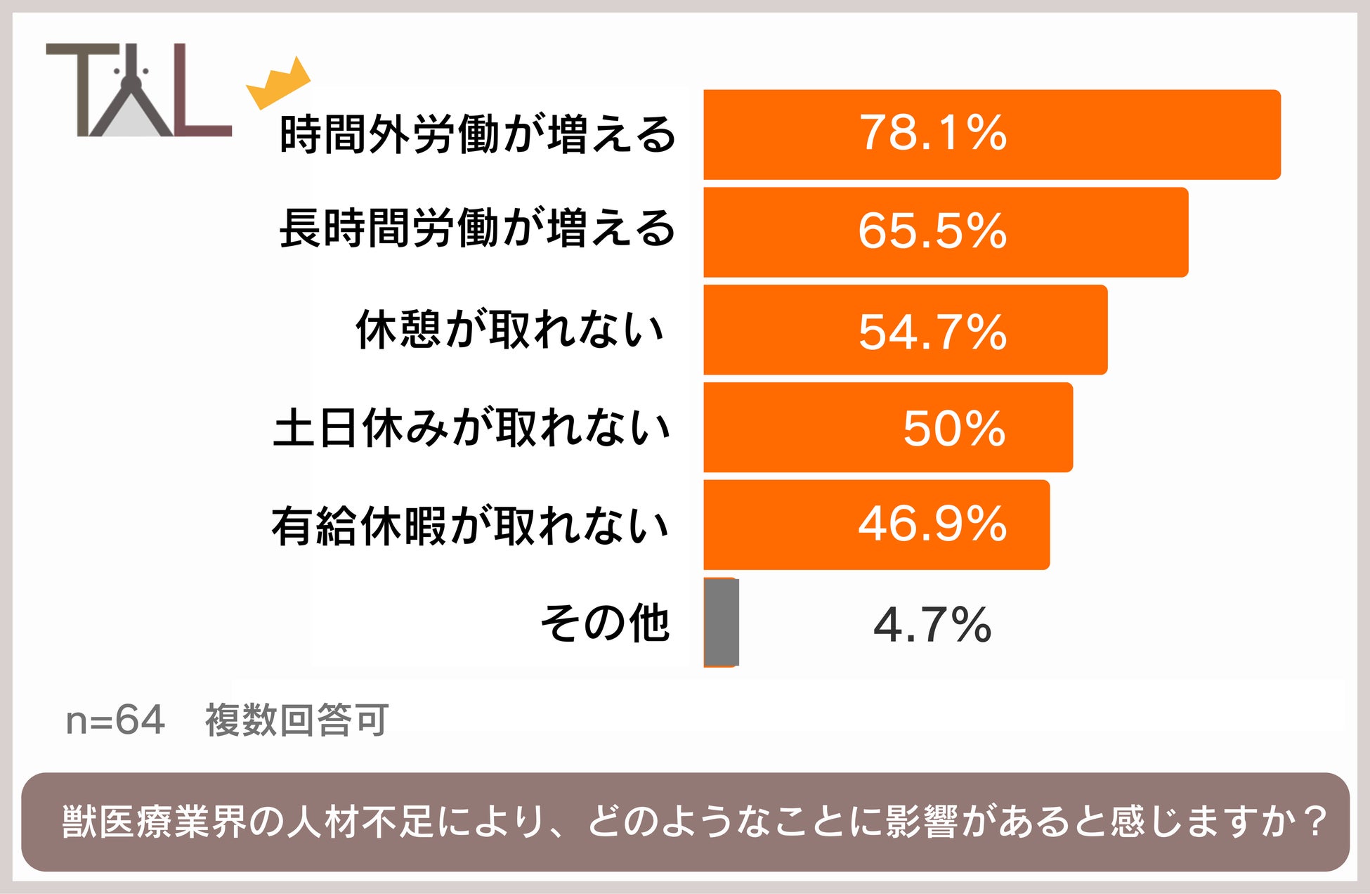 「はい」と回答した獣医師64名に対し、「獣医療業界の人材不足により、どのようなことに影響があると感じますか?(複数回答可)」と質問したところ、1位「時間外労働が増える」(78.1%)、2位「長時間労働が増える」(65.5%)、3位「休憩が取れない」(54.7%)という結果になりました。