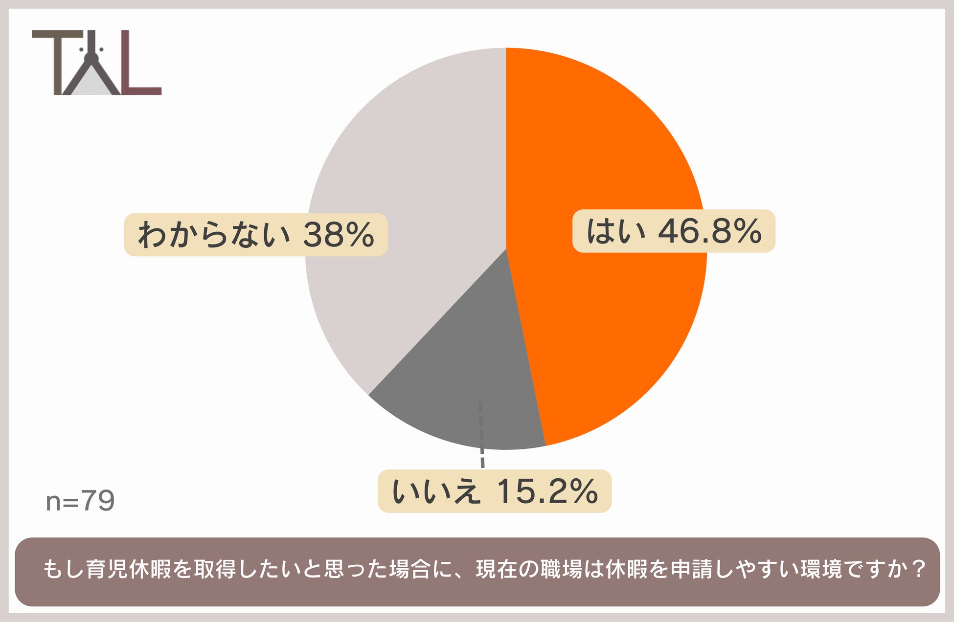 さらに、獣医師79名に対し、「もし育児休暇を取得したいと思った場合に、現在の職場は休暇を申請しやすい環境ですか?」と質問したところ、「はい」と答えた人が37人(46.8%)、「いいえ」と答えた人が12人(15.2%)、「わからない」と答えた人が30人(38%)という結果に。昨年の調査と比較し、育児休暇を取得しやすいと感じている獣医師が増えていることがわかりました。