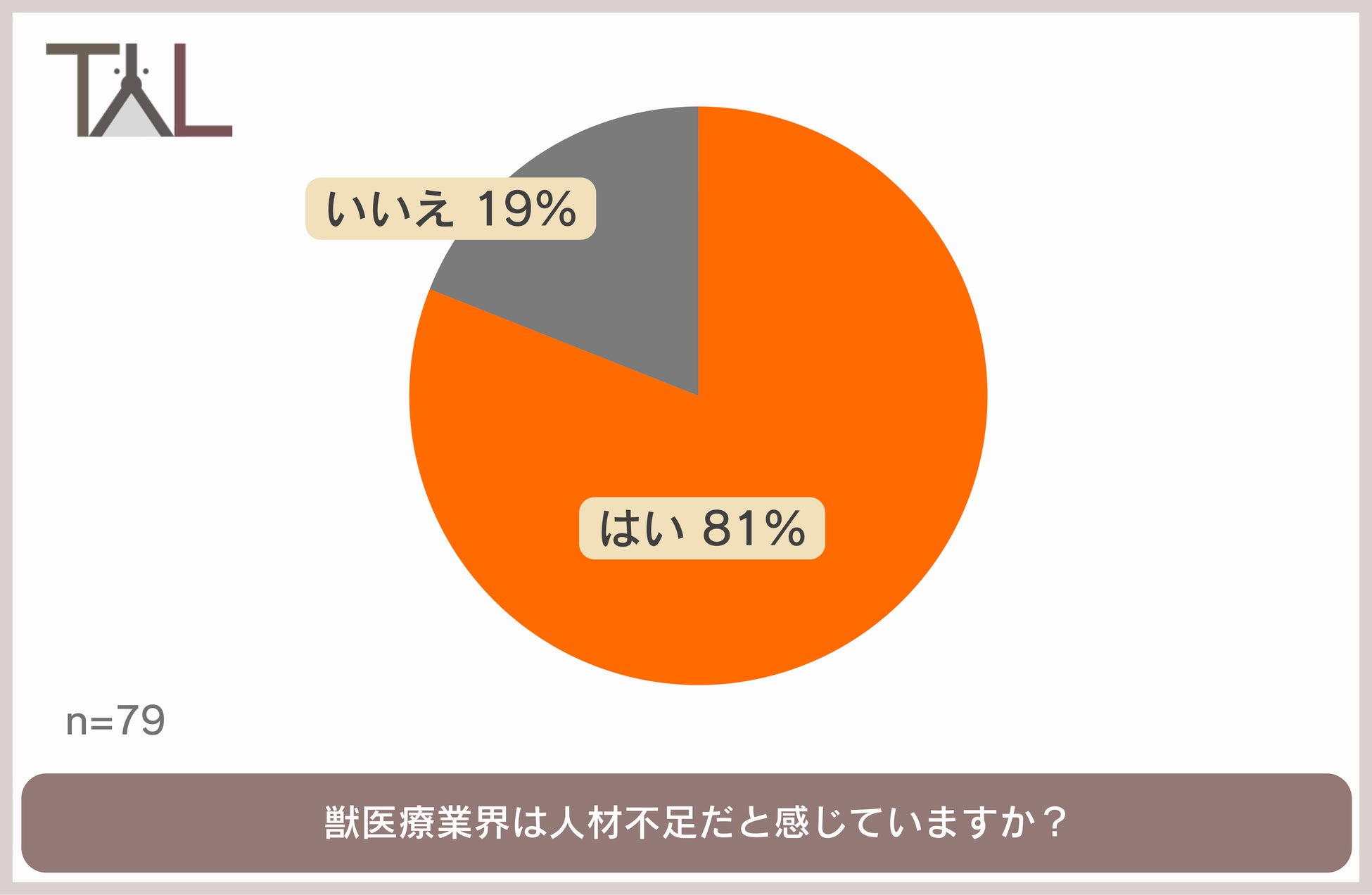 獣医師79名に対し、「獣医療業界は人材不足だと感じていますか?」と質問したところ、「はい」と答えた人が64人(81%)、「いいえ」と答えた人が15人(19%)という結果になりました。
