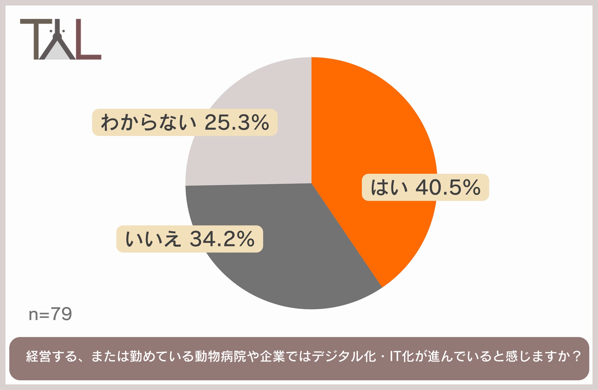 獣医師79名に対し、「経営する、または勤めている動物病院や企業ではデジタル化・IT化が進んでいると感じますか?」と質問したところ、「はい」と答えた人が32人(40.5%)、「いいえ」と答えた人が27人(34.2%)、「わからない」と答えた人が20人(25.3%)という結果になりました。