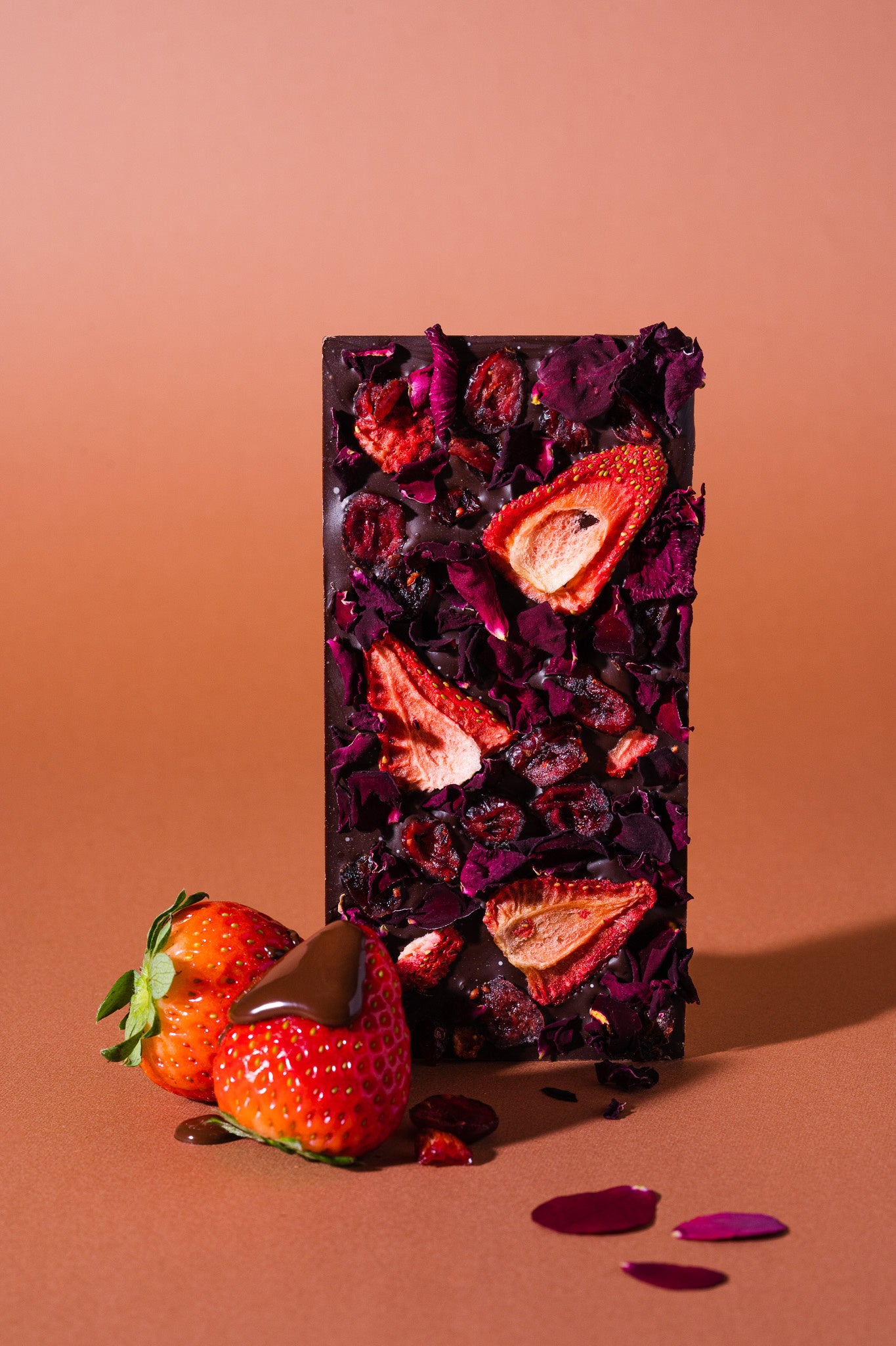 全国の最新トレンドスイーツ情報を発信するスイーツメディア「ufu.」所属のパティシエ佐藤美歩氏とコラボレーションした「薔薇のチョコレート」。ドライの苺とクランベリー、真っ赤な薔薇を使った華やかなタブレットチョコレートです。酸味のあるフルーツに、薔薇の香りが合わさり、よりフルーティーに、よりアロマが香るように仕上げました。