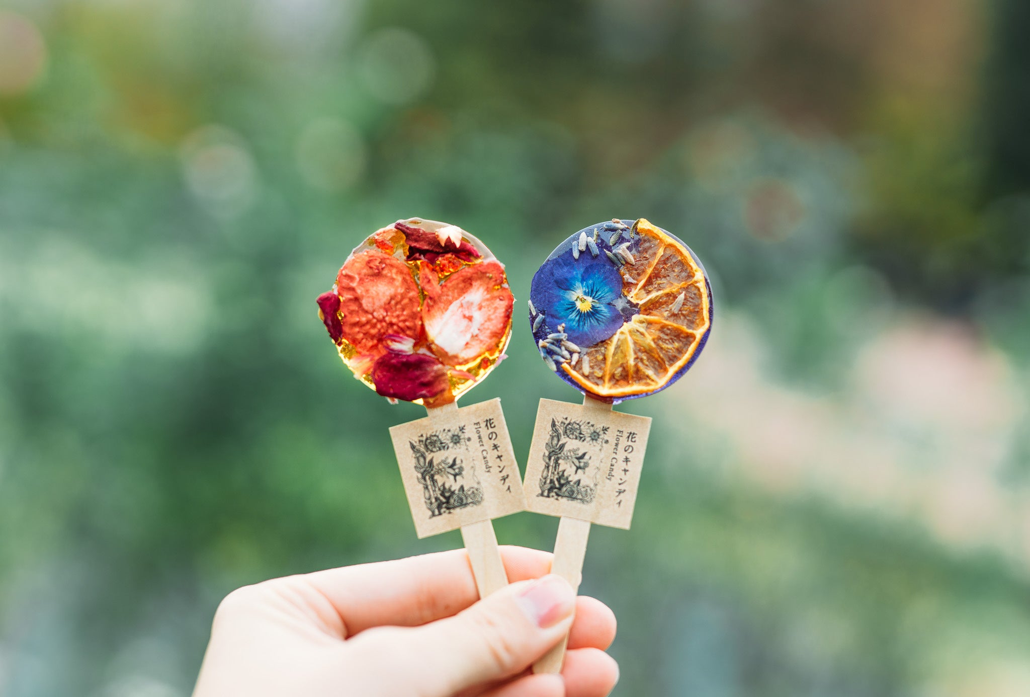 手にとっただけで幸せな気分になれる「花のキャンディ」ができあがりました。フレーバーは「ローズ&ストロベリー」と「ビオラ&オレンジ」の2種類。馨しい花の香りとフルーツの爽やかな酸味のハーモニーが楽しめます。素材は還元パラチノースなのでカロリーや歯磨きを気にしなくていいのも嬉しいヒミツ。ハッピー感高まる花のキャンディを街ブラのパートナーに。