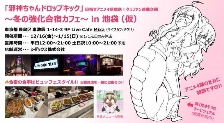 また、このプロジェクトの併設企画として、池袋でコラボカフェ「4期に向けて強化合宿ですの(仮)」を1月15日(日)まで開催しています。強化合宿の名にふさわしい企画・飲食を楽しめるほか、リアルタイムにプロジェクトの進捗を共有しています。