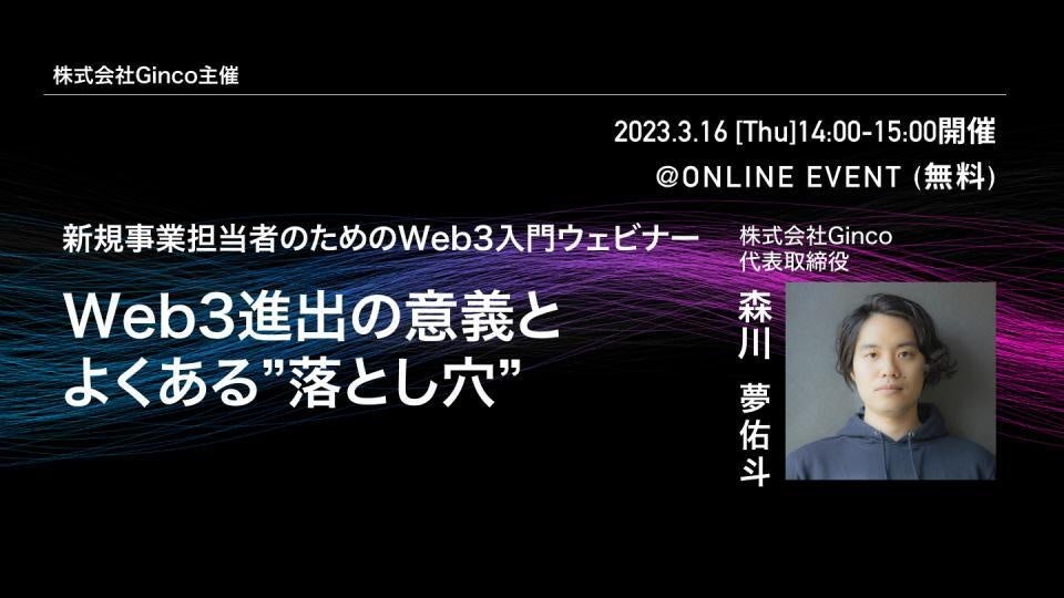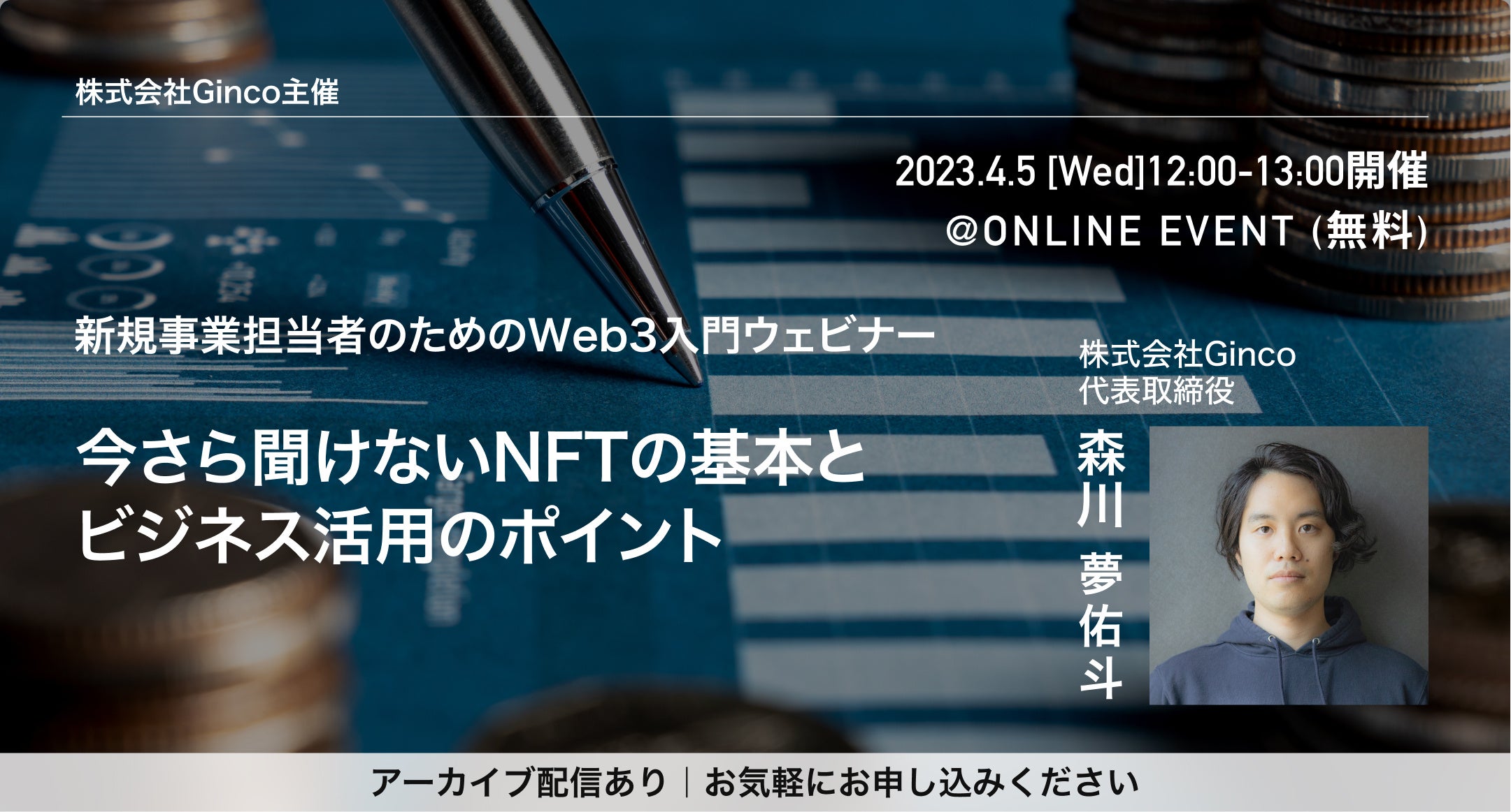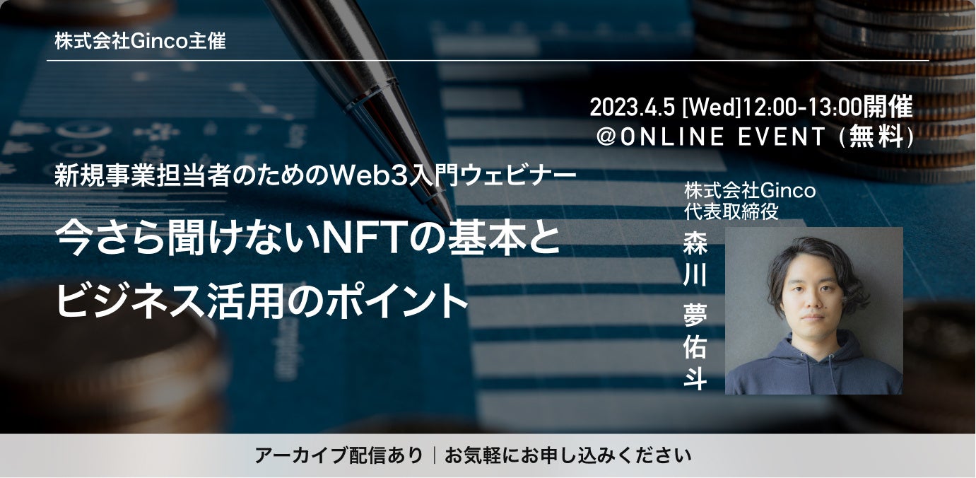 ブロックチェーン技術を活用し、企業のWeb3事業を支援するWeb3 Development Companyの株式会社Ginco(本社:東京都中央区、代表取締役:森川夢佑斗、以下当社)は、Web3領域への新規参入を検討している企業向けに、「今さら聞けないNFTの基本とビジネス活用のポイント」を解説するウェビナーを開催いたします。