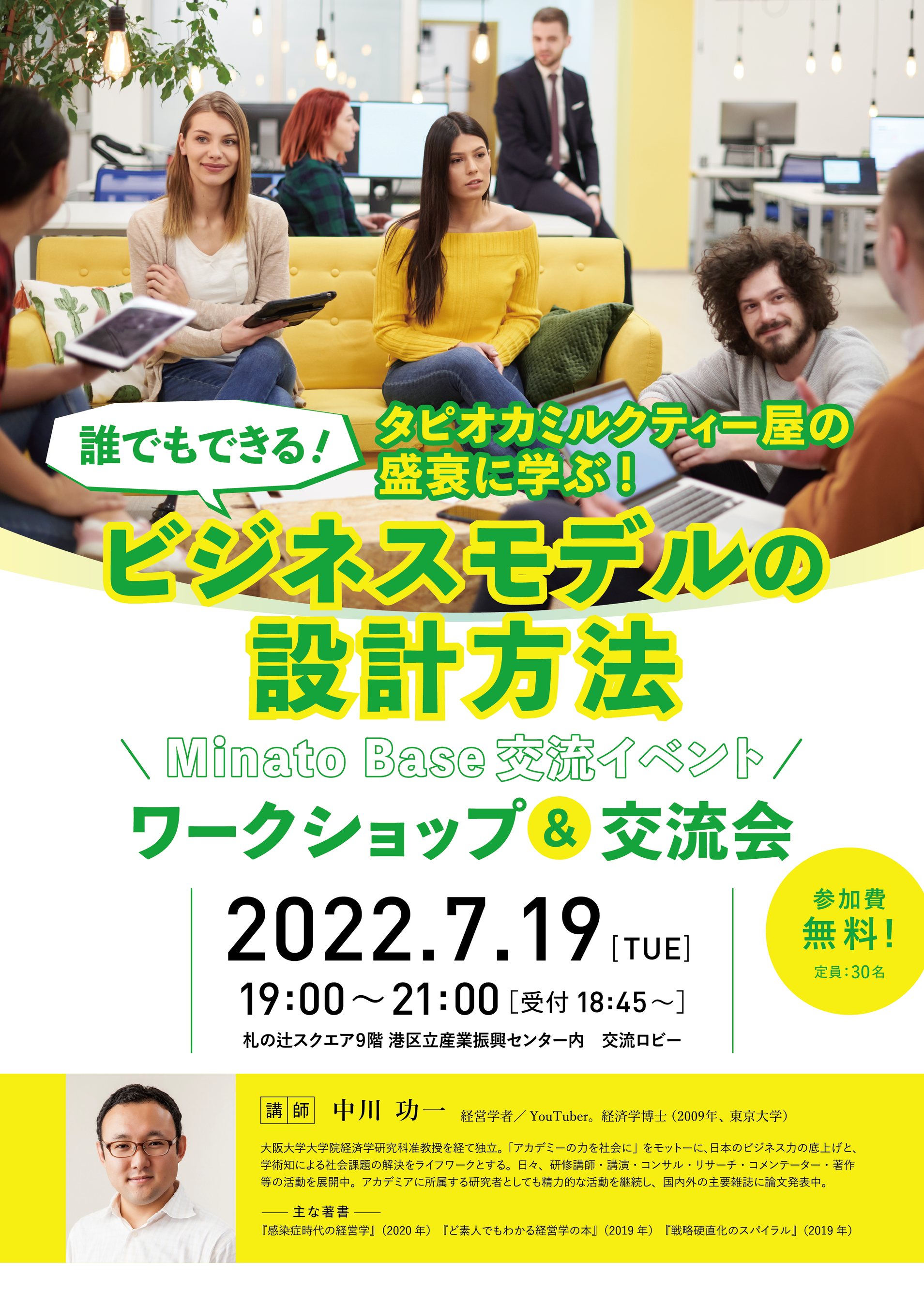 2022年7月19日、港区立産業振興センターにて「タピオカミルクティー屋の盛衰に学ぶ!ビジネスモデルの設計方法 Minato Base 交流イベント」を開催します。ぜひご参加くださいませ。