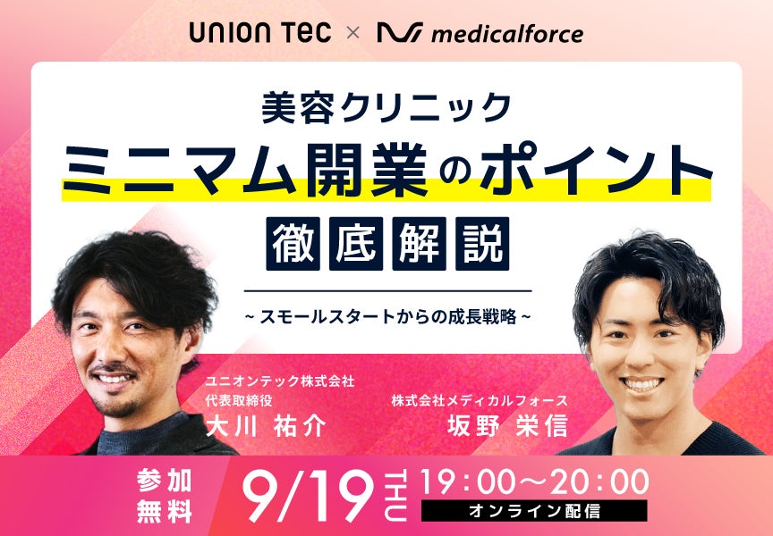 「Build a new standard.」をミッションに、オフィス・店舗の内装デザイン・設計・施工をワンストップで提供するユニオンテック株式会社(東京都渋谷区、代表取締役社長:大川祐介)は、自由診療向けのオールインワンSaaS「medicalforce」を提供する株式会社メディカルフォース(所在地:東京都品川区、代表取締役社長:大嶋 翼)との共催で、ウェビナー『美容クリニック ミニマム開業のポイント徹底解説 〜スモールスタートからの成長戦略〜』を開催いたします。