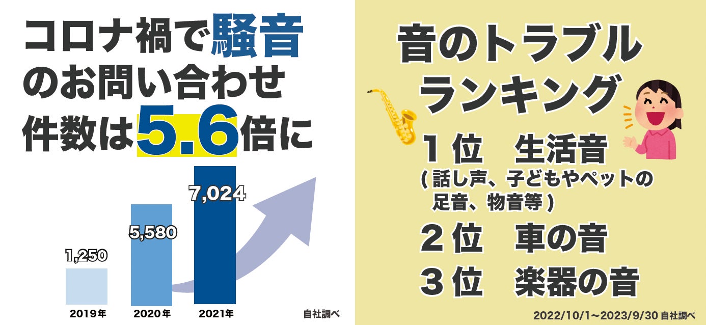日本の7大公害の一つと言われている「騒音」問題。特にコロナ禍以降、全国的に騒音に係る苦情の件数は増加傾向にあります。同社では騒音に関する電話相談が、コロナウィルス流行時以前と比較して 約5.6倍 に急増し、直近のデータ(2022/10/1〜2023/09/30、3,854件)によると、全体のご相談のうち58.8%を「生活音」によるお悩みが占めました。