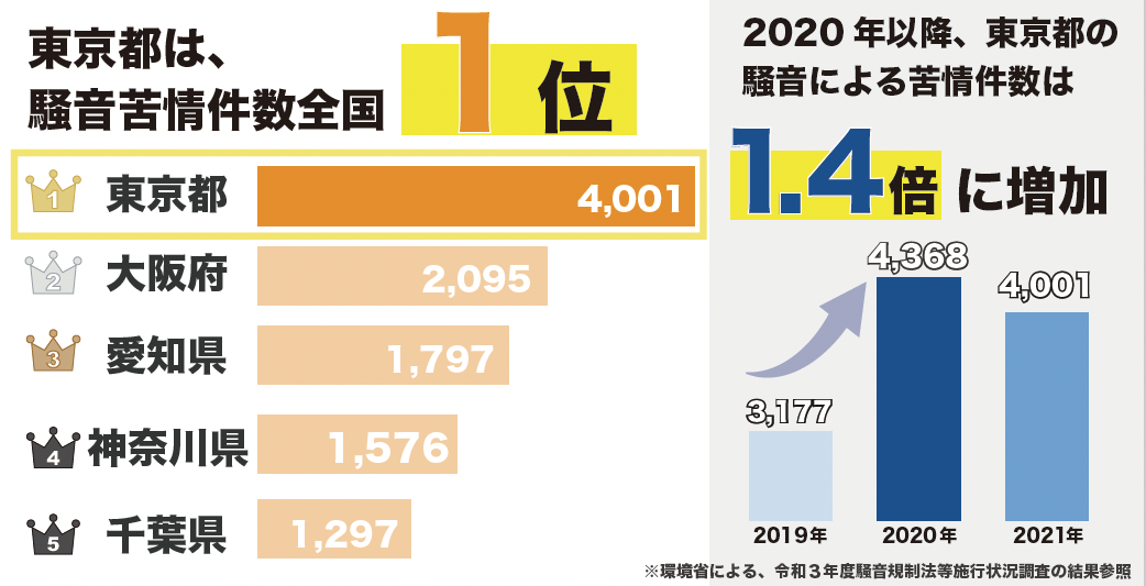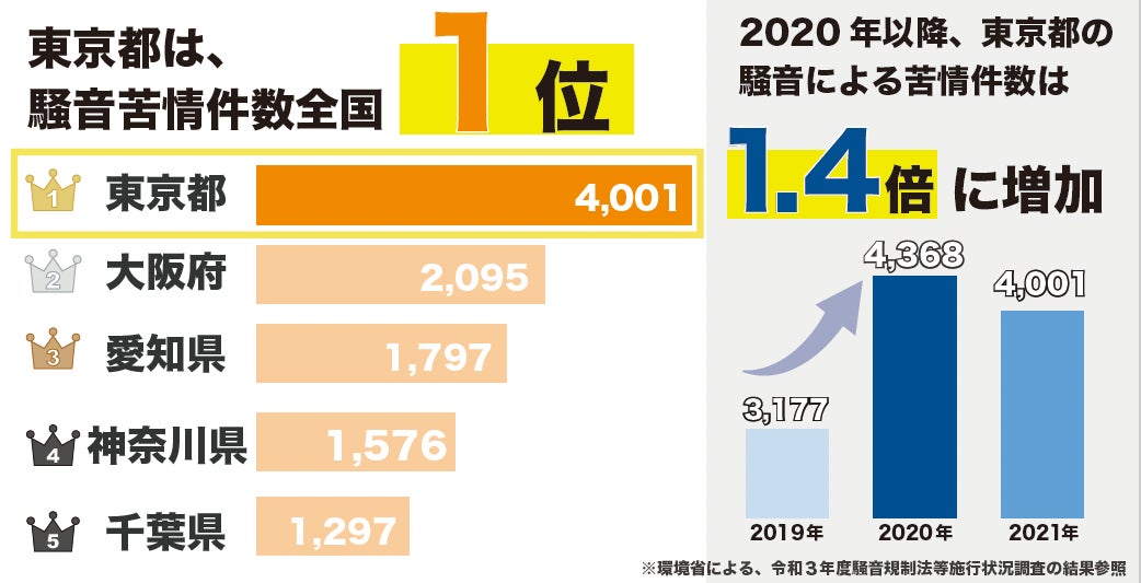 今回ポップアップイベントで出展をする東京都は、令和3年度の騒音苦情件数が全国1位(※)。コロナ禍での騒音による苦情件数も増加傾向にあります。