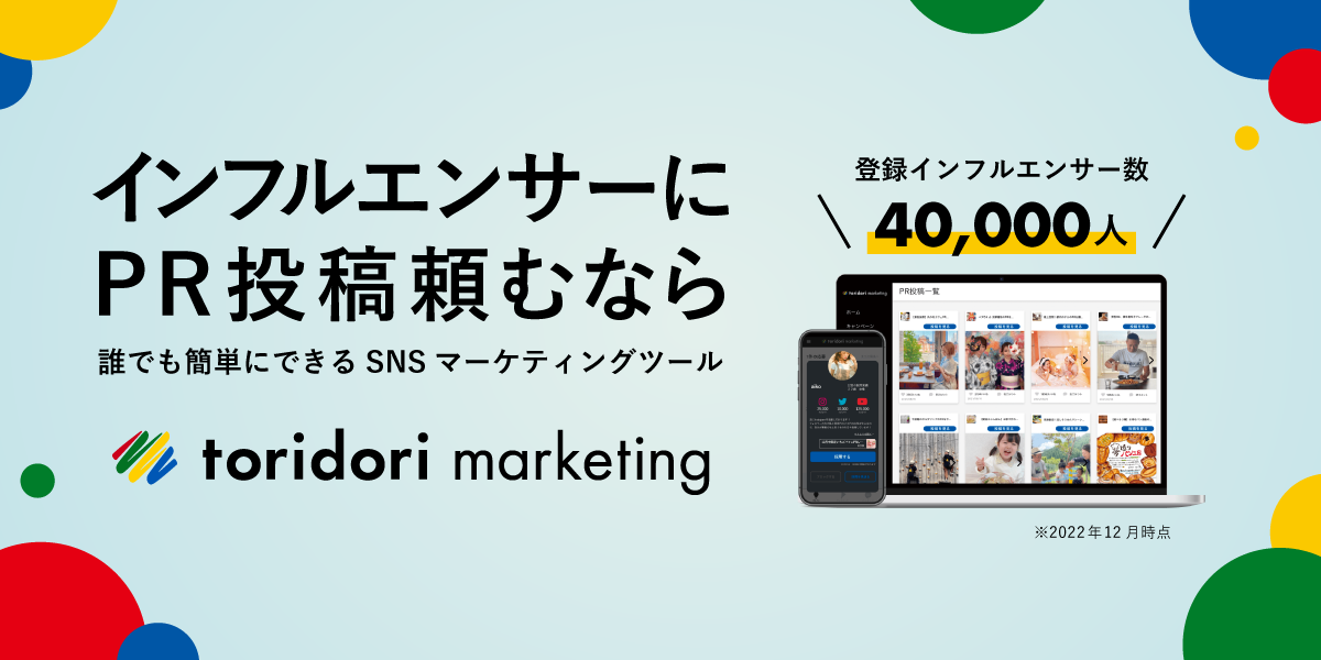 ▼インフルエンサーマーケティングプラットフォーム『toridori marketing』公式サイト:https://top-marketing.toridori.me/