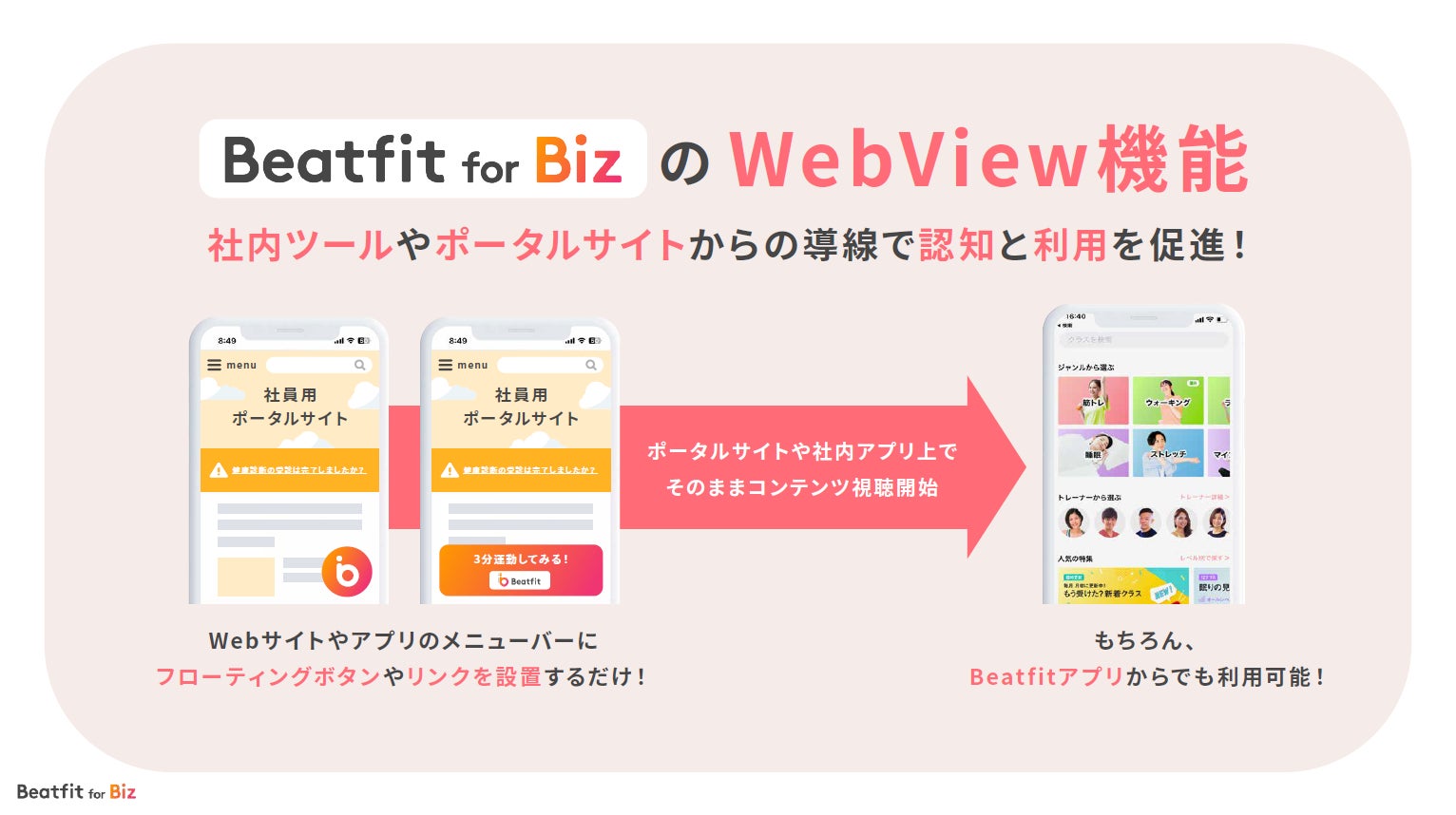 従業員の運動習慣化を通してBMI減少をサポートすることで、健康経営銘柄およびホワイト500認定企業から採択されているパーソナルフィットネスアプリ「Beatfit for Biz」が、従業員への施策浸透率を高める次の一手としてWebView機能の提供を開始することをお知らせします。本機能のリリースは2024年1月を予定しており、利用問い合わせの受付をスタートいたします(要件によっては企業様個別のシステム対応が発生し、導入まで一定期間を要します)。