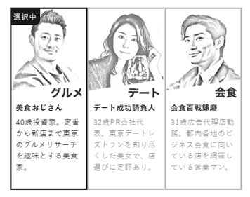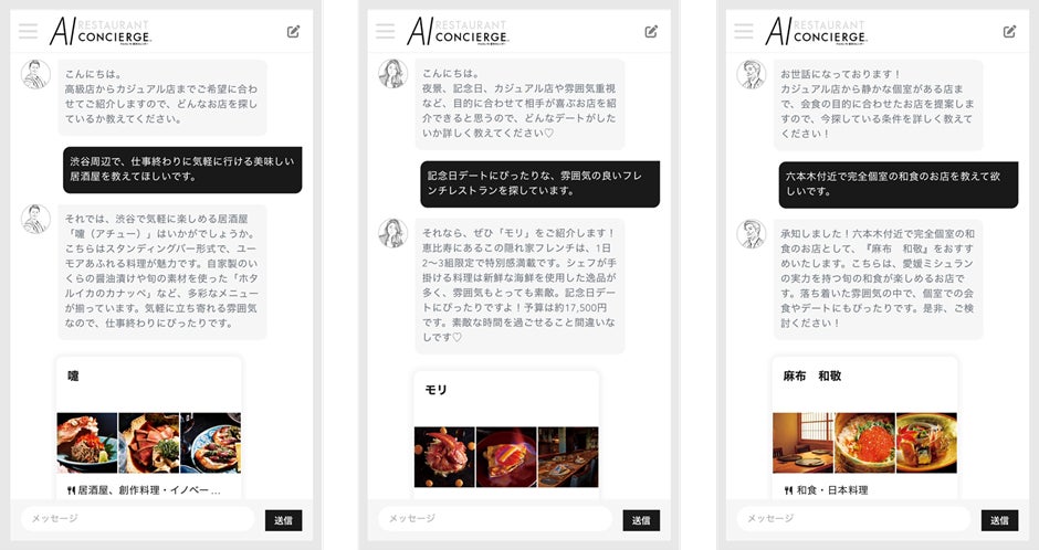 「AIレストランコンシェルジュ」では、人格の異なる3つのAIをご用意しました。グルメリサーチ全般を得意とするAI、デートや会食といったシチュエーションに特化した2種類のAIがあり、目的や用途により使い分けてご利用いただけます。ぜひお気軽にご相談ください。