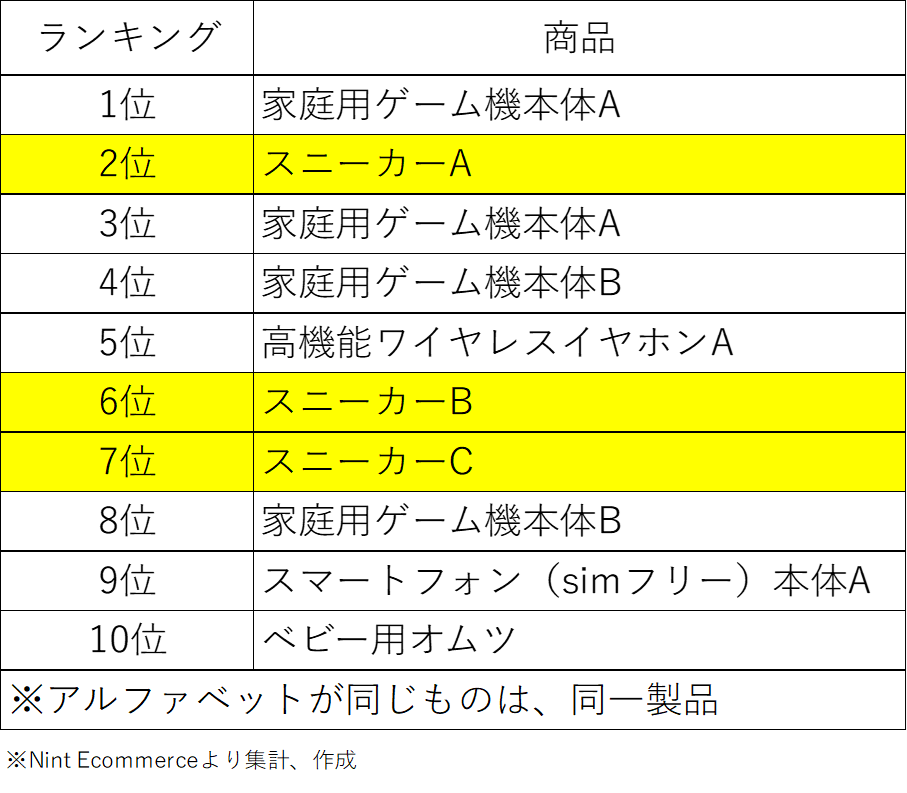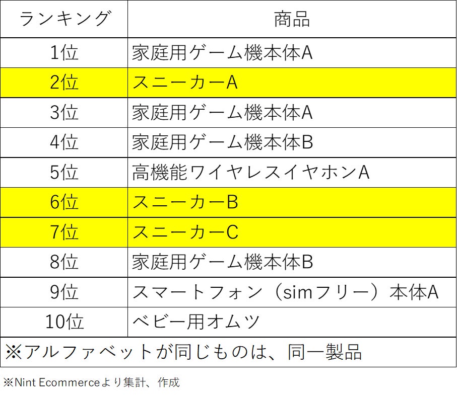 注目は2・6・7位にランクインしたスニーカー(同一メーカーA社)ではないでしょうか。
