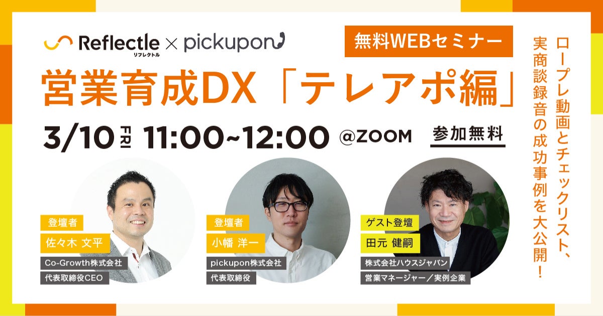 通話内容をAIが要約するCTI SaaSの「ピクポン」を提供するpickupon株式会社(千葉県市川市、代表:小幡 洋一、以下ピクポン)は、営業力向上を実現する営業育成DXシステム「リフレクトル」を提供するCo-Growth株式会社(本社:東京都千代田区、代表:佐々木 文平)とオンラインセミナーを2023年3月10日(金)に、インサイドセールス代行事業を行う株式会社soraプロジェクト(福岡県筑紫野市、代表:樋口 裕貴)とオンラインセミナーを2023年3月22日(水)に開催します。