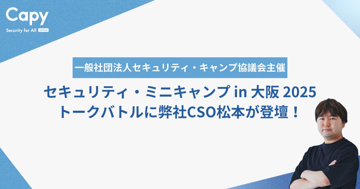 Capy株式会社(本社:東京都千代田区、代表取締役:岡田満雄)は、一般財団法人関西情報センターと一般社団法人セキュリティ・キャンプ協議会が共同で主催する「セキュリティ・ミニキャンプ in 大阪 2025」において、弊社の松本がトークバトルセッションに登壇することをお知らせいたします。