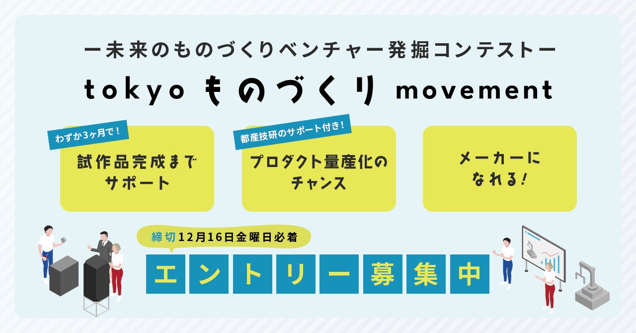 株式会社ツクリエ(本社:東京都千代田区 代表取締役:鈴木英樹 以下、ツクリエ)は、東京都及び地方独立行政法人東京都立産業技術研究センター(以下、都産技研)から受託する令和4年度ものづくりベンチャー育成事業 「Tokyo ものづくり Movementー未来のものづくりベンチャー発掘コンテストー」のエントリー募集を開始しました。