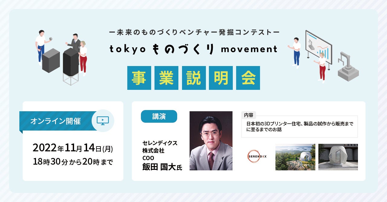 また、ゲストに日本初3Dプリンター住宅を手掛けるスタートアップ企業、セレンディクス株式会社 COOの飯田国大(はんだくにひろ)氏をお招きし、講演および都産技研研究員とのパネルディスカッションを行います。