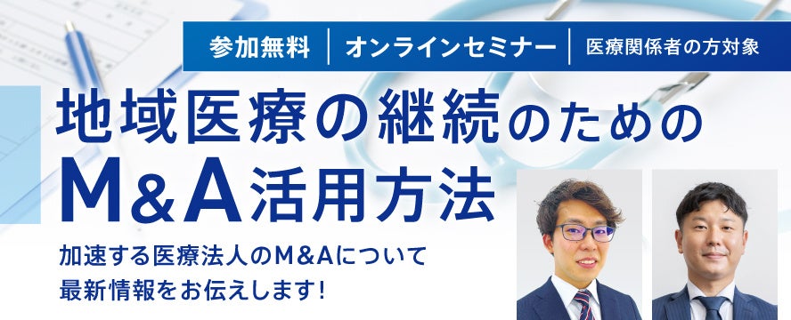 この度、9月10日(日)に経営課題を抱える医療関係者の方を対象としたセミナー『地域医療の継続のためのM&A活用方法』をオンラインにて開催いたします。