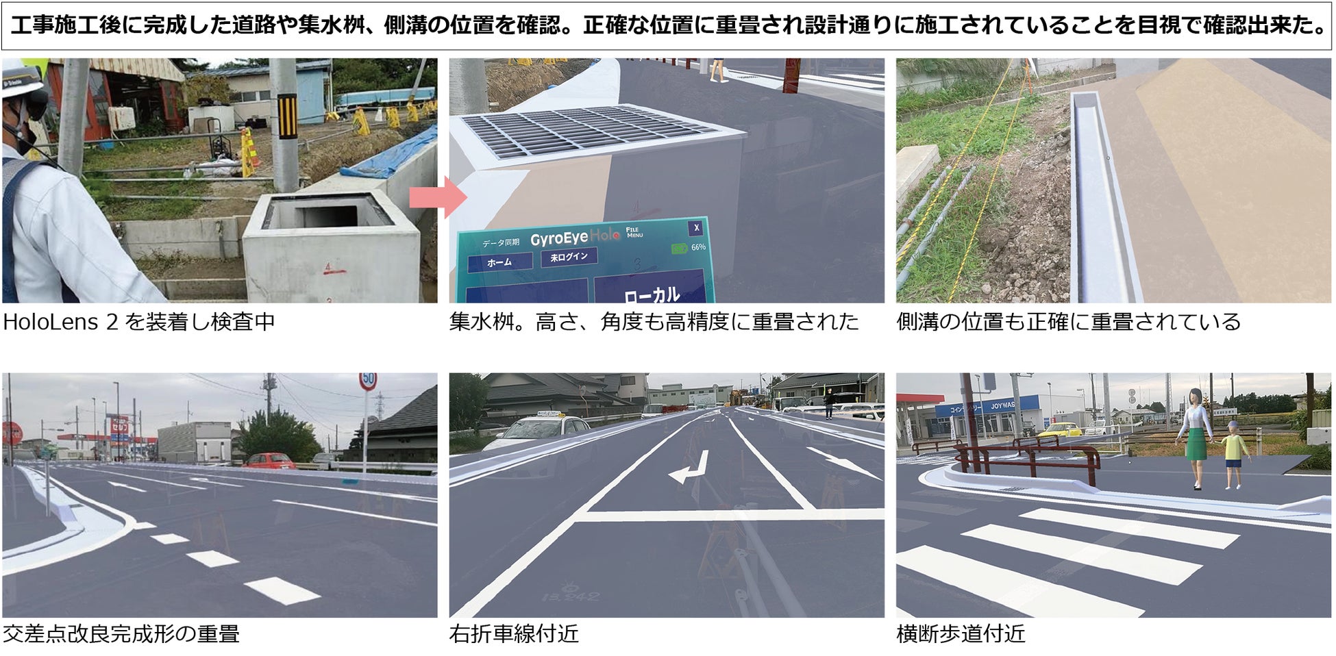 東京鋪装工業株式会社 DX推進課 担当部長 白山公三様は「今回現場で原寸投影された3Dモデルは、道路面、歩道、縁石、側溝や集水桝等の構造物で、空間に完成形がミリ単位に高精度に重畳(ちょうじょう)される結果となりました。今後想定される利用は、工事着工前の関係者の完成イメージの共有や、完成後の出来形確認で、工事品質確保や生産性向上が期待されます。関係者の手応えも上々で今後の運用手順の検討に進めたい」と話しています。
