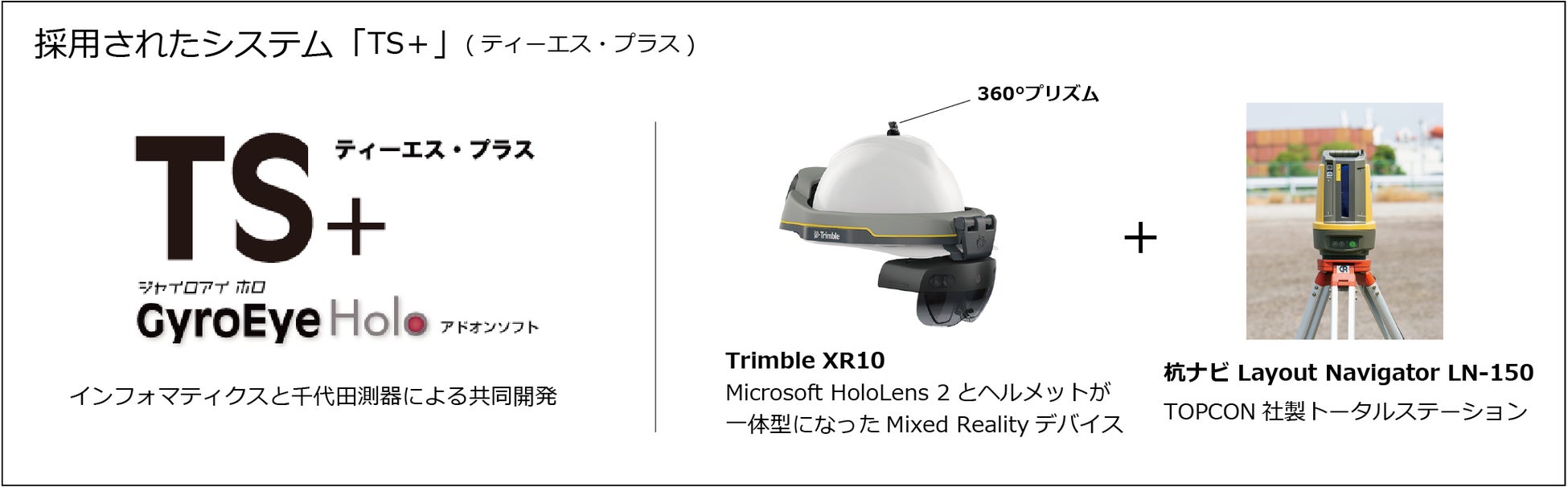新たに採用したシステムは、Microsoft HoloLens 2のホログラフィックの投影位置を測量機器トータルステーションの連携による高精度表示と、位置ズレをリアルタイムに補正することで上記課題が解消され、精度を求める建設現場で実践活用できるようになっています。システムは株式会社インフォマティクスと千代田測器株式会社が共同開発し、特許取得したTS+(ティーエス・プラス)でMicrosoft HoloLens 2専用アプリケーションGyroEye Holo(ジャイロアイホロ)のアドオンソフトとして動作します。