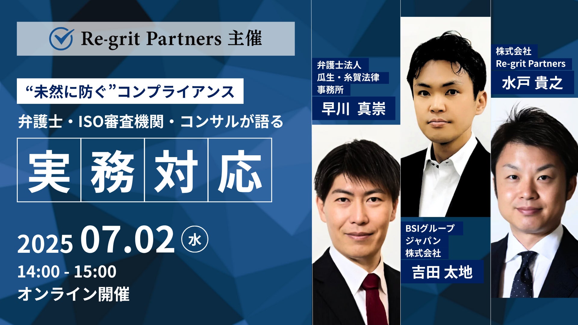 株式会社Re-grit Partners(本社:東京都千代田区、代表取締役社長:山木 智史、以下「当社」)は、コンプライアンス違反の予防・発見・対応を分かりやすく解説するオンラインセミナーを開催いたします。本セミナーでは、元日本郵政株式会社CCOで弁護士の早川真崇氏と当社所属Managing Directorの水戸貴之が、コンプライアンス違反が会社に与える影響や違反行為を未然に防止するための平時の備え、有事の対応ポイントについて解説いたします。また、英国規格協会(BSI)の日本法人であるBSIグループジャパンの吉田太地氏をお招きし、国際的な規格を用いたコンプライアンスマネジメント体制の構築についてご紹介いただきます。コンプライアンス違反発生時の対応力を高めるとともに、平時の備えについても学べる機会として、ぜひご参加ください。
