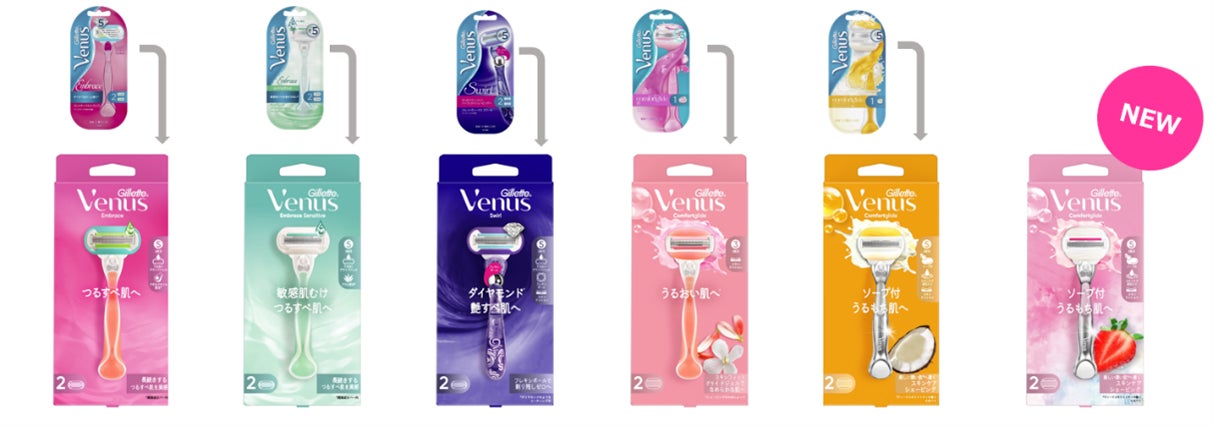 「ジレットヴィーナス」シリーズ、ボディ用製品のパッケージを全てリニューアル。日本の消費者に好感度が高い、ポップで可愛いデザインとカラーになり、それぞれの製品の特長や便益、違いも一目でわかるようになりました。またパッケージ素材に紙を使用することで、従来のパッケージに比べ、より環境に配慮したパッケージに生まれ変わりました。