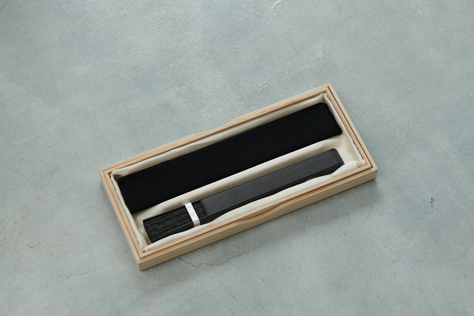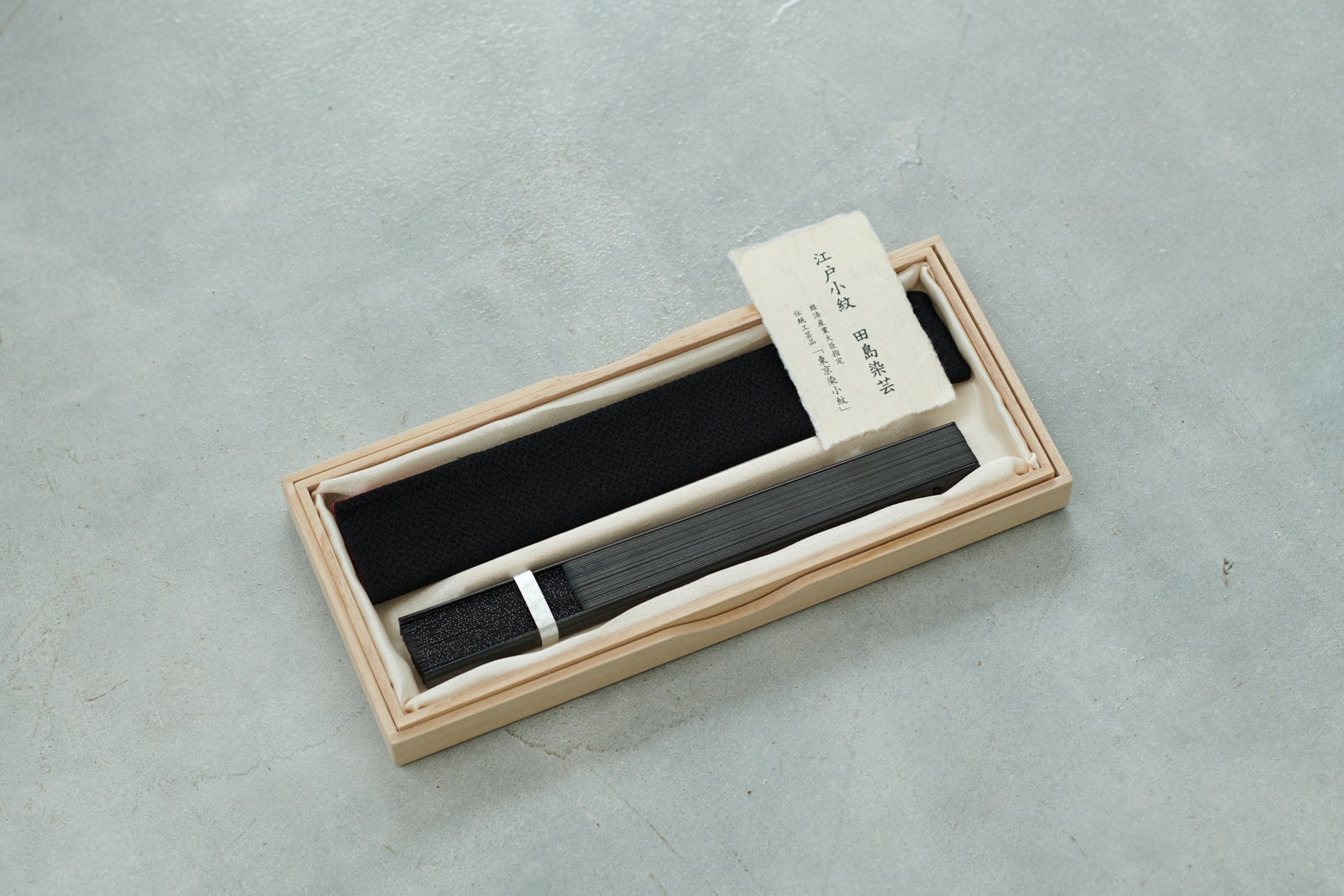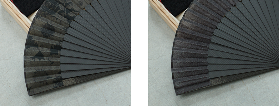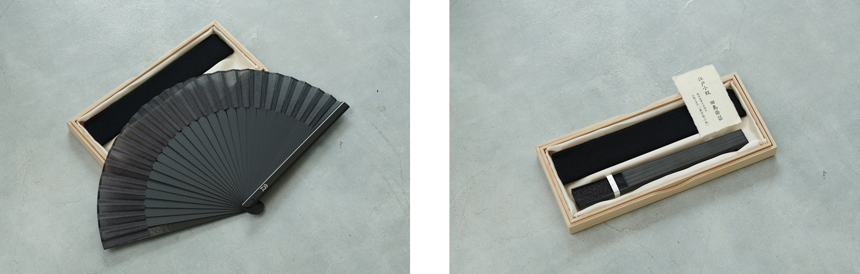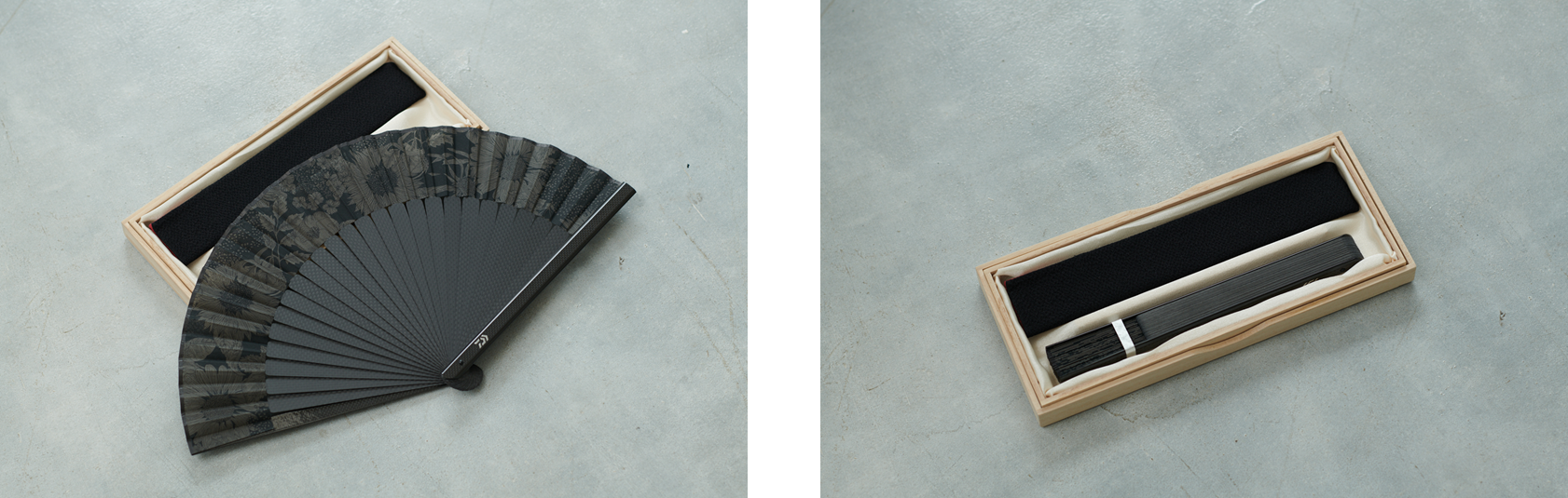 また、扇面には2つのデザインをご用意しました。伝統工芸に指定されている「江戸小紋」の極薄シルクと、英国王室御用達ロンドンの老舗百貨店・リバティ百貨店のリバティプリントが施されたコットン生地の2タイプ。どちらも黒基調で格式高いデザインに仕上げました。持ち運びにご活用いただけるちりめん加工を施した扇子入れとともに、桐箱に入れてご用意しています。