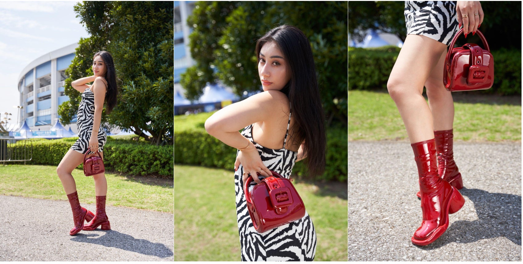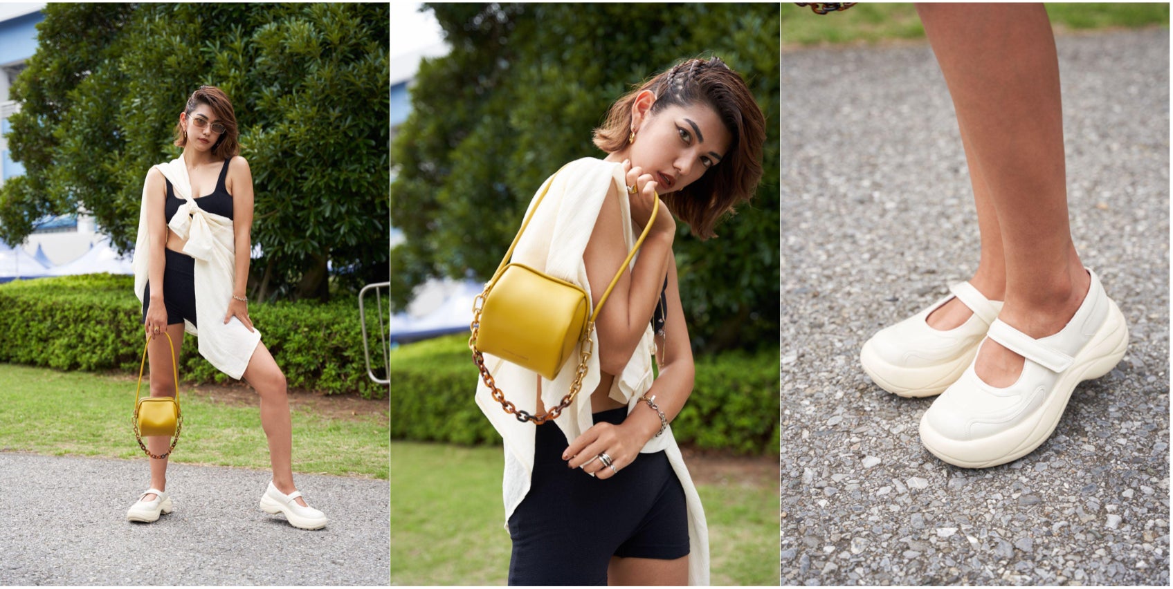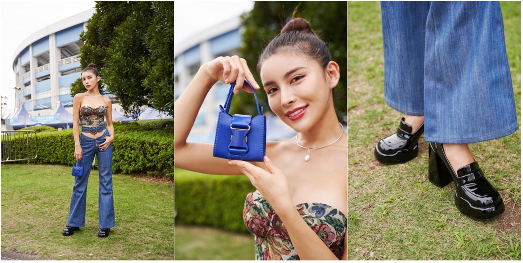 恋愛リアリティショーでも活躍する美玲さんは、Cobaltカラーのミニバッグをアクセサリー代わりに取り入れた爽やかなスタイル。バッグは取り外し可能なチェーンがついており、ショルダーバッグとしても使用できます。Lula パテントプラットフォームローファーは、ローファーのプレッピーな要素と、ダイナミックなヒールの近未来的な要素が合わさり、”Y2K”ムードが高まる一足です。