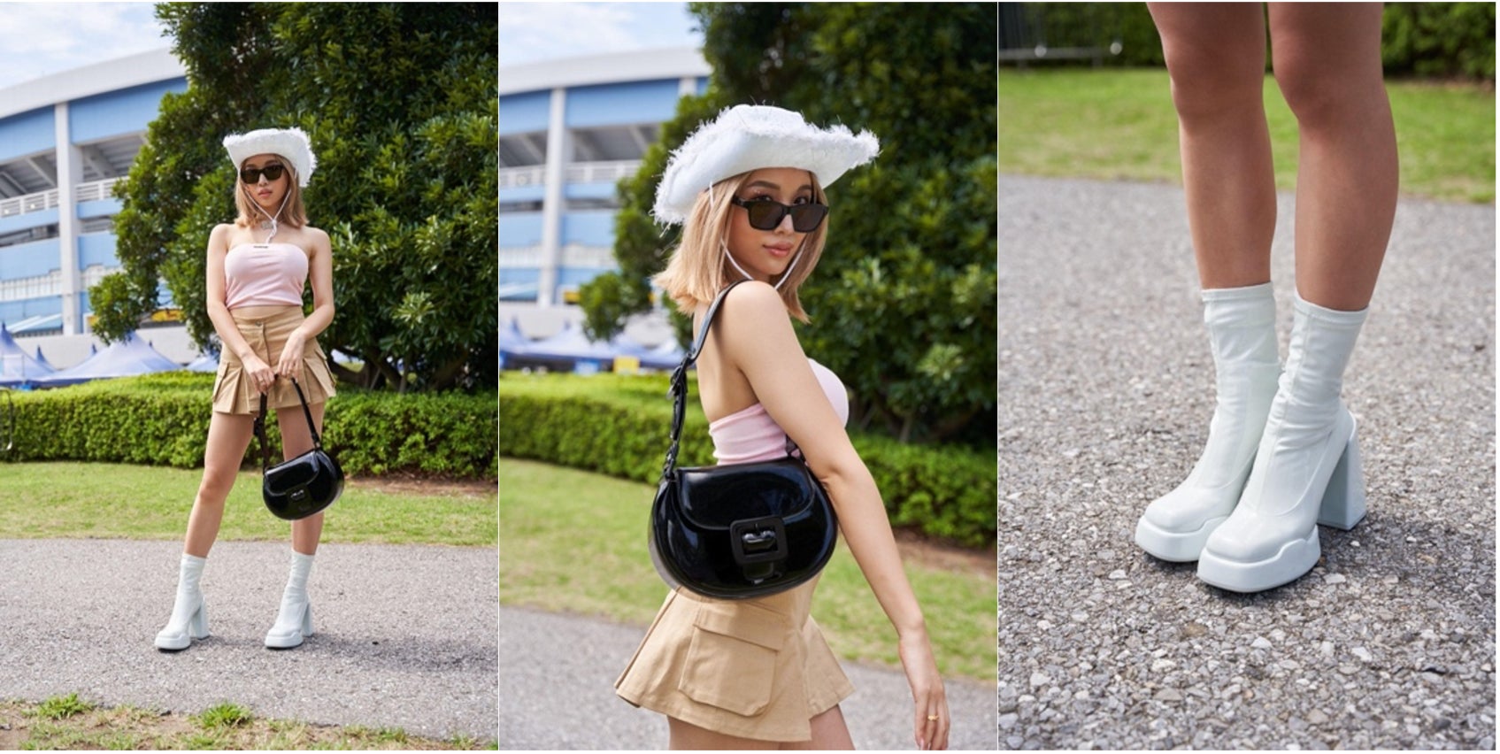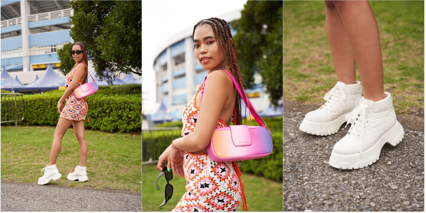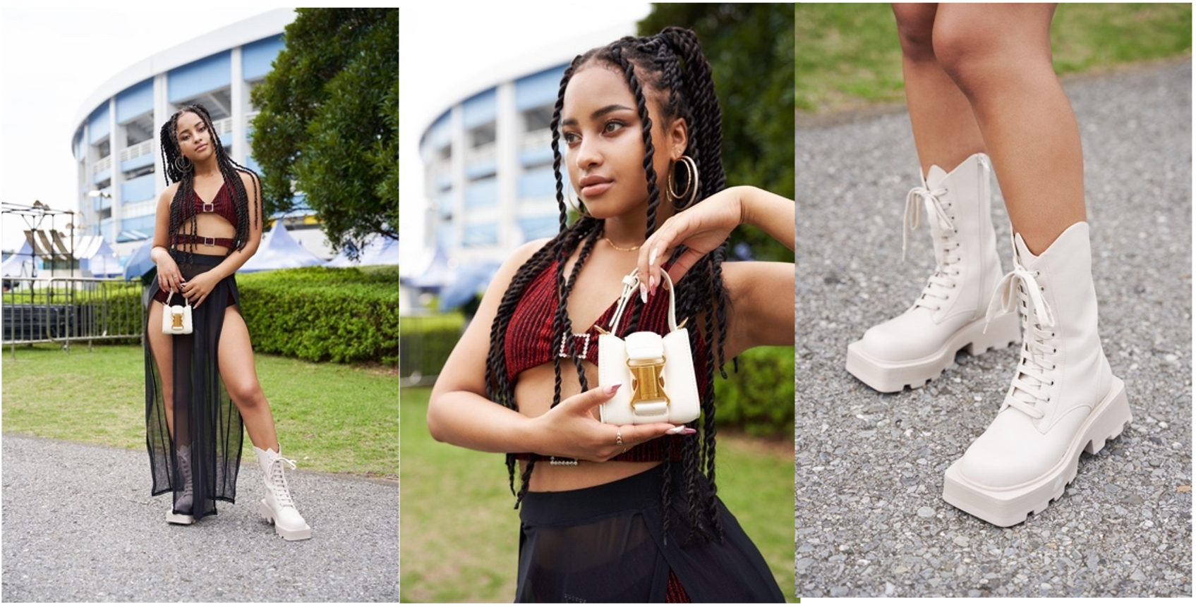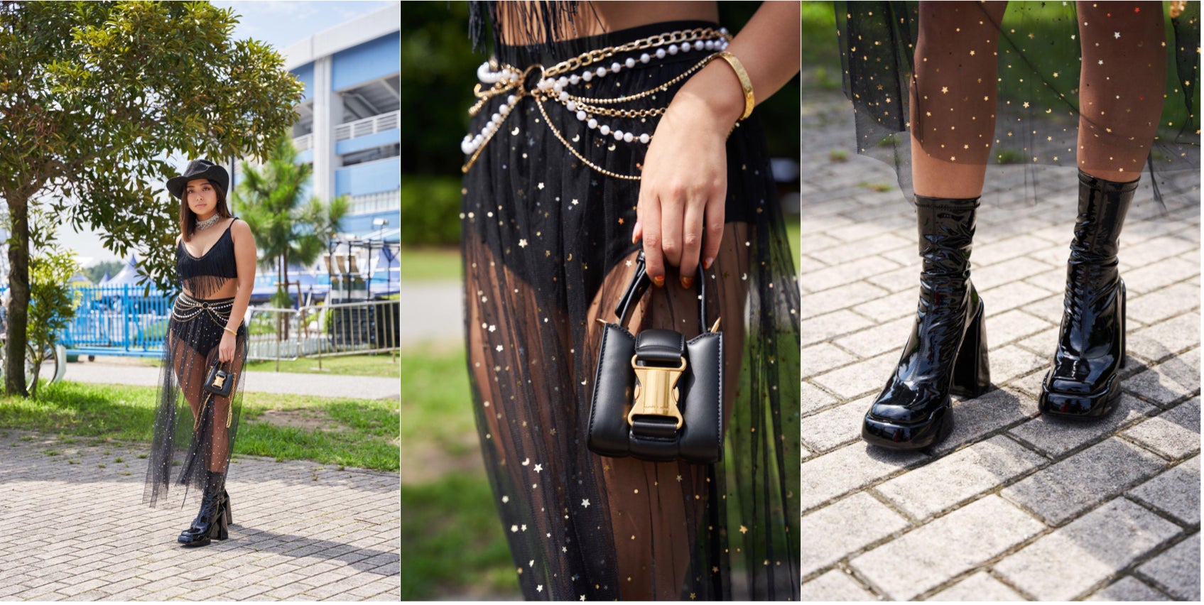 恋愛リアリティショーでも活躍する美玲さんは、Cobaltカラーのミニバッグをアクセサリー代わりに取り入れた爽やかなスタイル。バッグは取り外し可能なチェーンがついており、ショルダーバッグとしても使用できます。Lula パテントプラットフォームローファーは、ローファーのプレッピーな要素と、ダイナミックなヒールの近未来的な要素が合わさり、”Y2K”ムードが高まる一足です。
