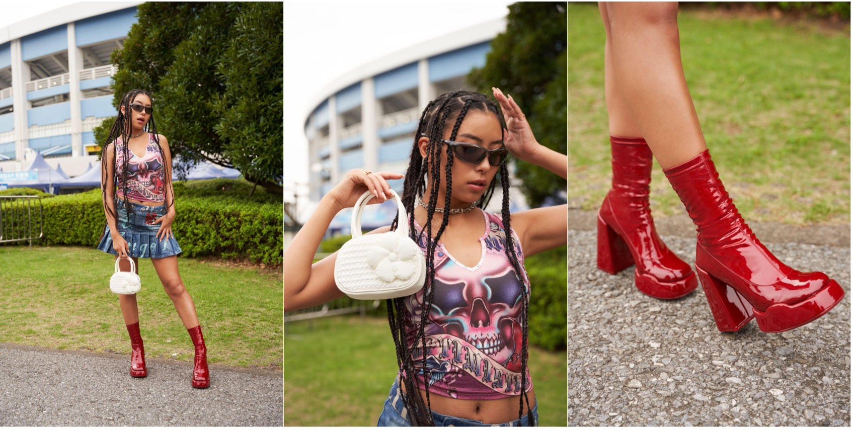 個性的なY2Kファッションに、フラワーモチーフのフェミニンなバッグをあわせたMIXスタイル。バッグはリサイクルポリエステル素材を使用し、環境にも配慮したアイテムです。ブーツは、艶感のあるパテント素材とソールのボリューム感で、ワンランク上のトレンドコーデを演出します。