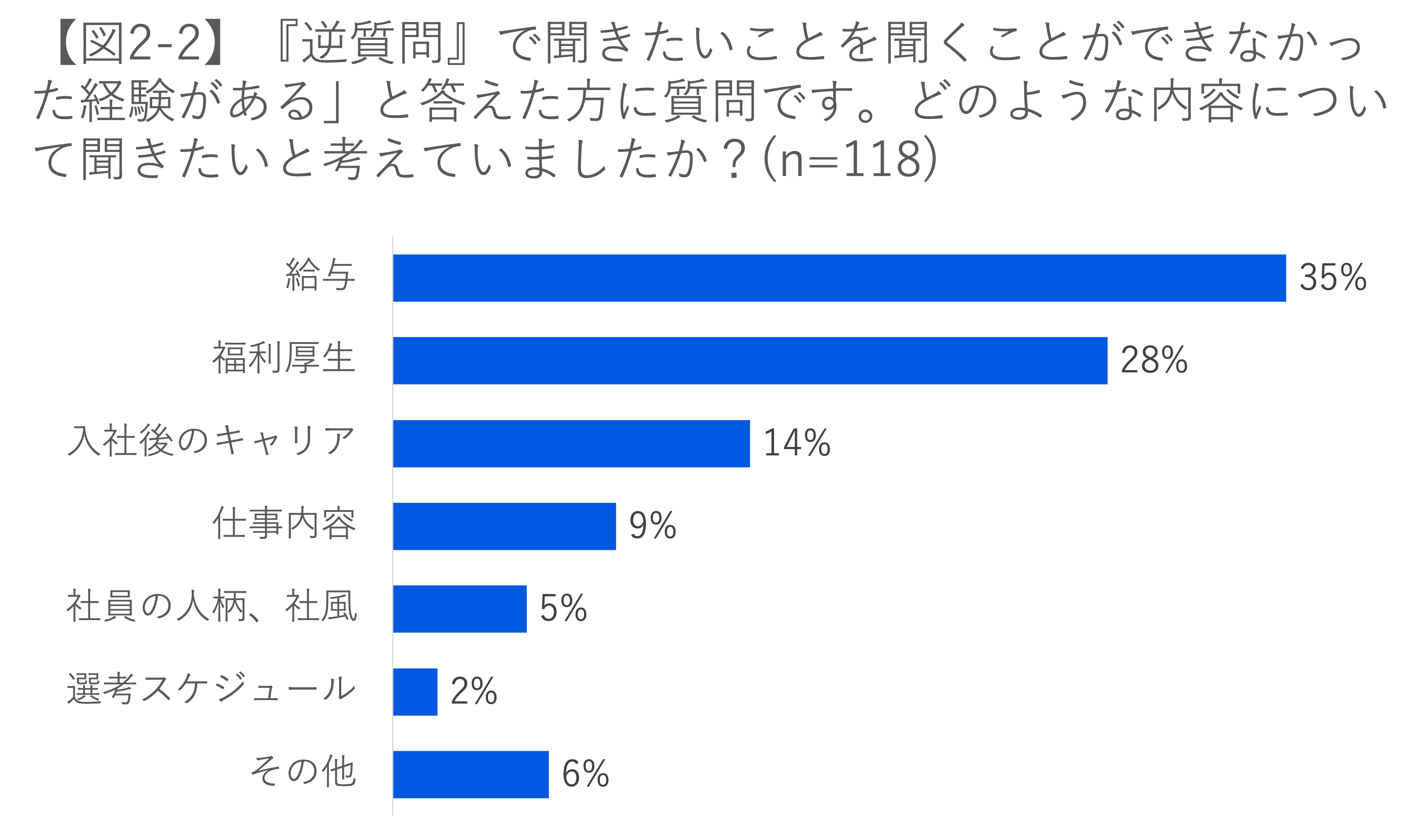 「逆質問」の場で「聞きたいことを聞くことができなかった」学生は、全体の37%でした。「聞きたかったが聞けなかった内容」について尋ねたところ、「給与」「福利厚生」が回答の半数以上に及びました。選考中に処遇や待遇について尋ねることをタブーと感じている学生が多いことがわかります。