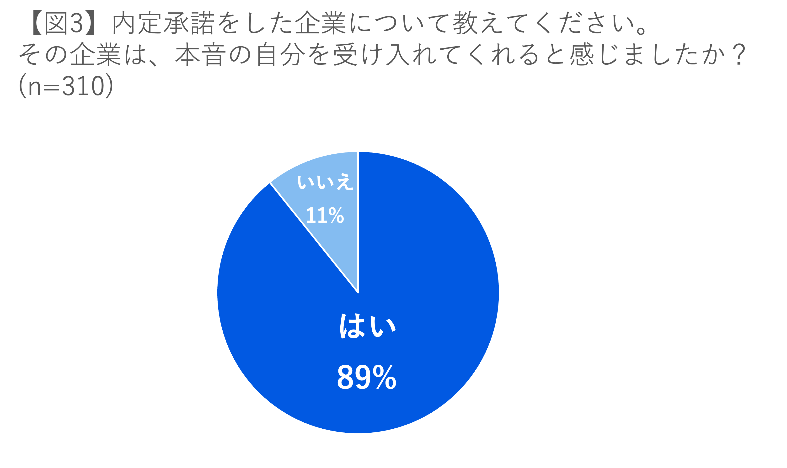面接の場で「本音で話せなかった経験がある」学生が半数以上であったとはいえ、89%の学生が、実際に内定を承諾した企業については「本音の自分を受け入れていると感じた企業」であると回答しました。23卒の学生にとって、内定承諾における決め手の一つが「本音の自分を受け入れてくれるかどうか」がであることがうかがえる結果となりました。