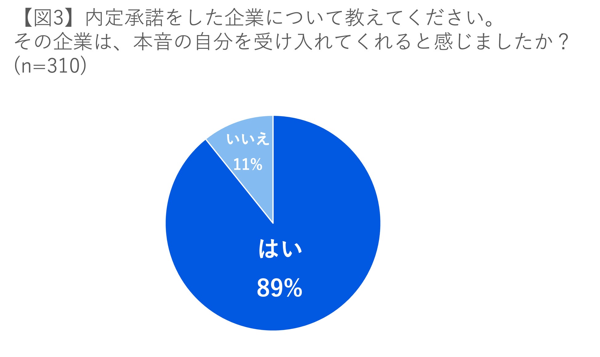 3. 全体の約9割が、「本音の自分を受け入れてくれると感じた企業に入社を決めた」と回答。