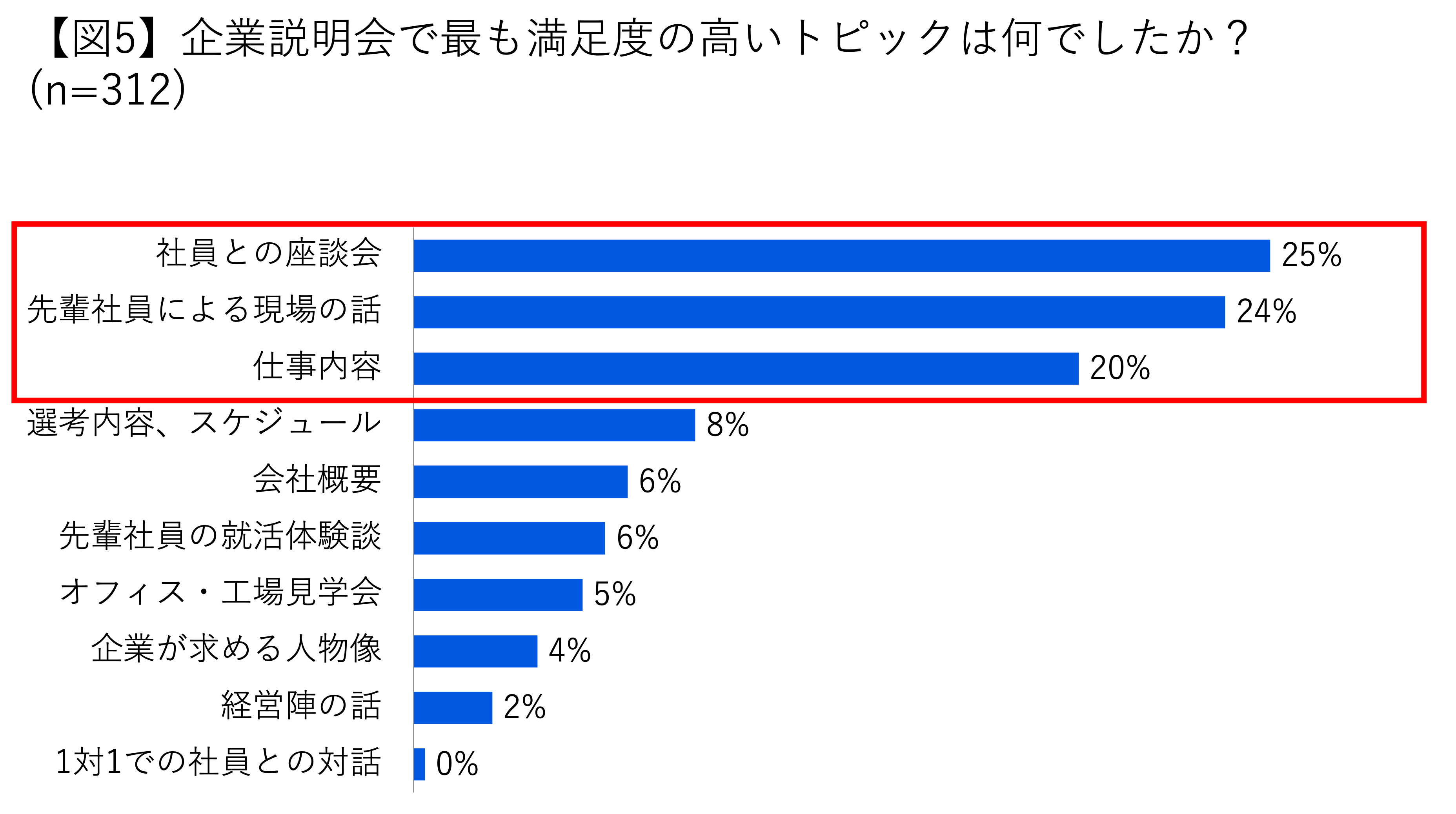 5. 「満足度の高かった企業説明会コンテンツ」は、「社員との座談会」「先輩社員による現場の話」、「仕事内容」が上位3位を占める結果に。