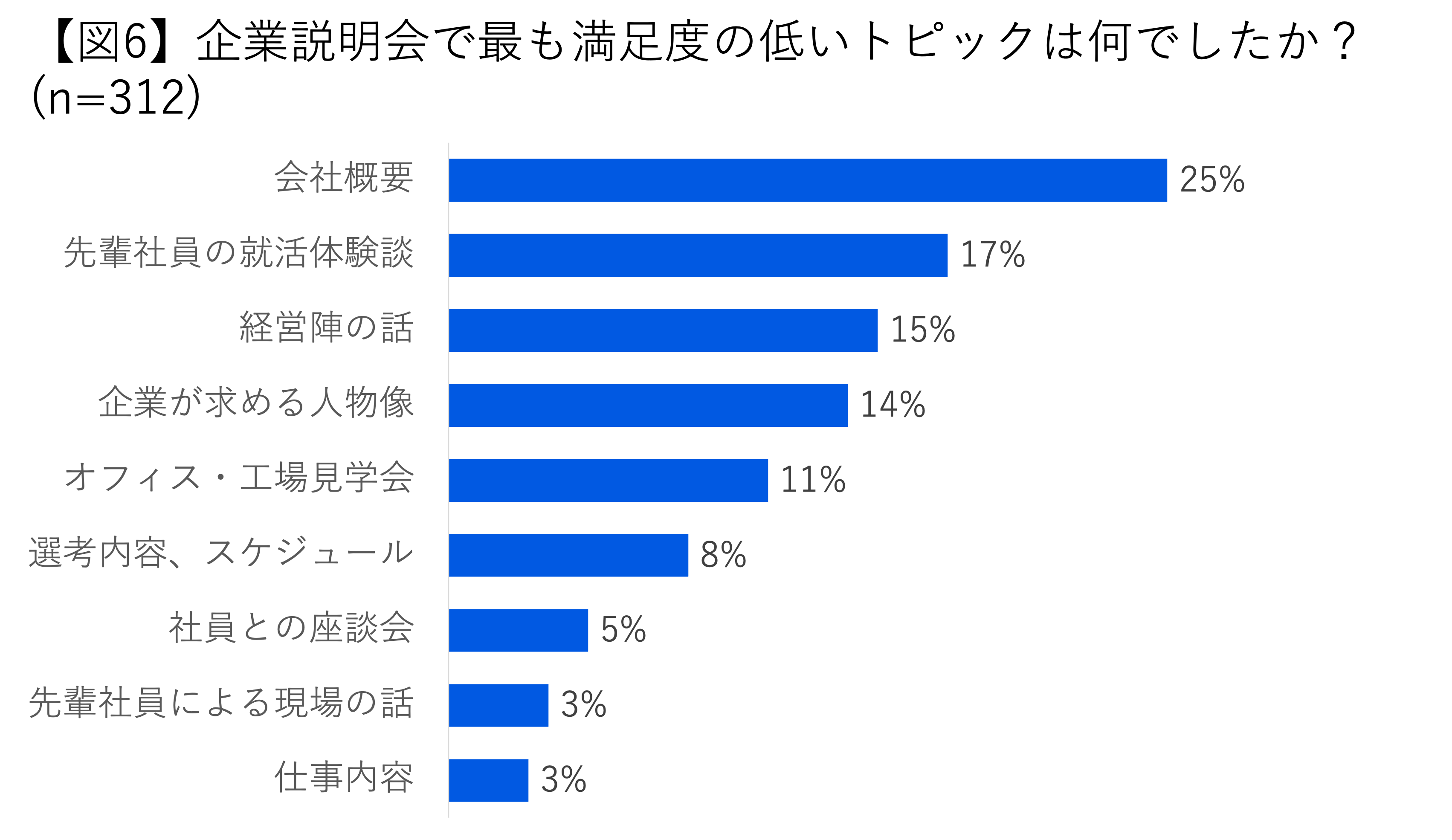 「企業説明会で最も満足度の高いトピックは何でしたか?」という質問に対し、「先輩社員による現場の話」「社員の座談会」、それらに次いで「仕事内容」が挙げられました。先輩社員からのリアルな話、仕事内容の説明を通じて、「いかに入社後の働く姿をイメージできるか」を重視していているものと考えられます。
