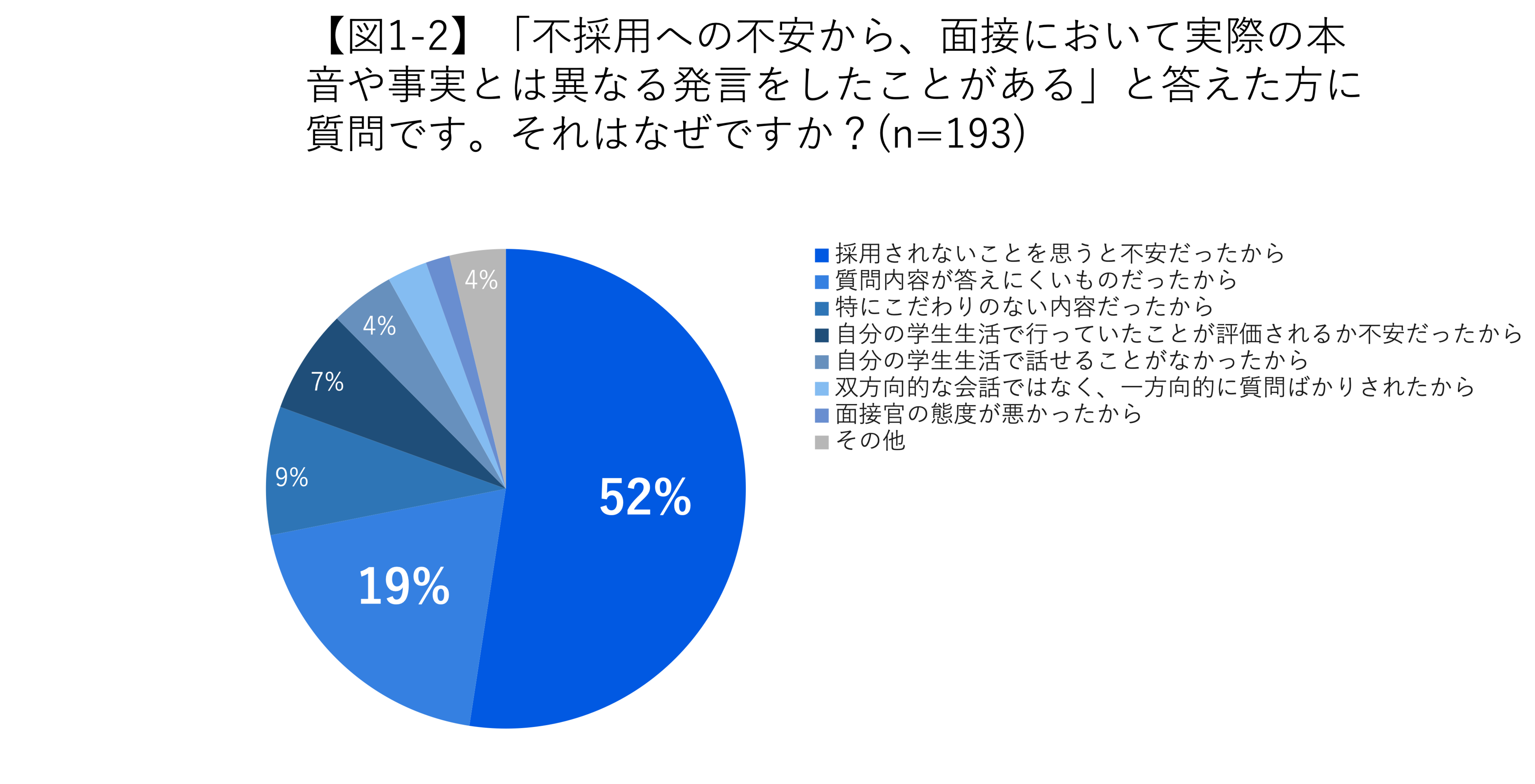 また、学生の半数以上は、選考の過程で「本音や事実と異なる発言」をしていたことも明らかになりました。背景には不採用への不安があるほか、企業にとって望ましい姿を推察して内容を作り替えてしまうことがうかがえる結果となりました。